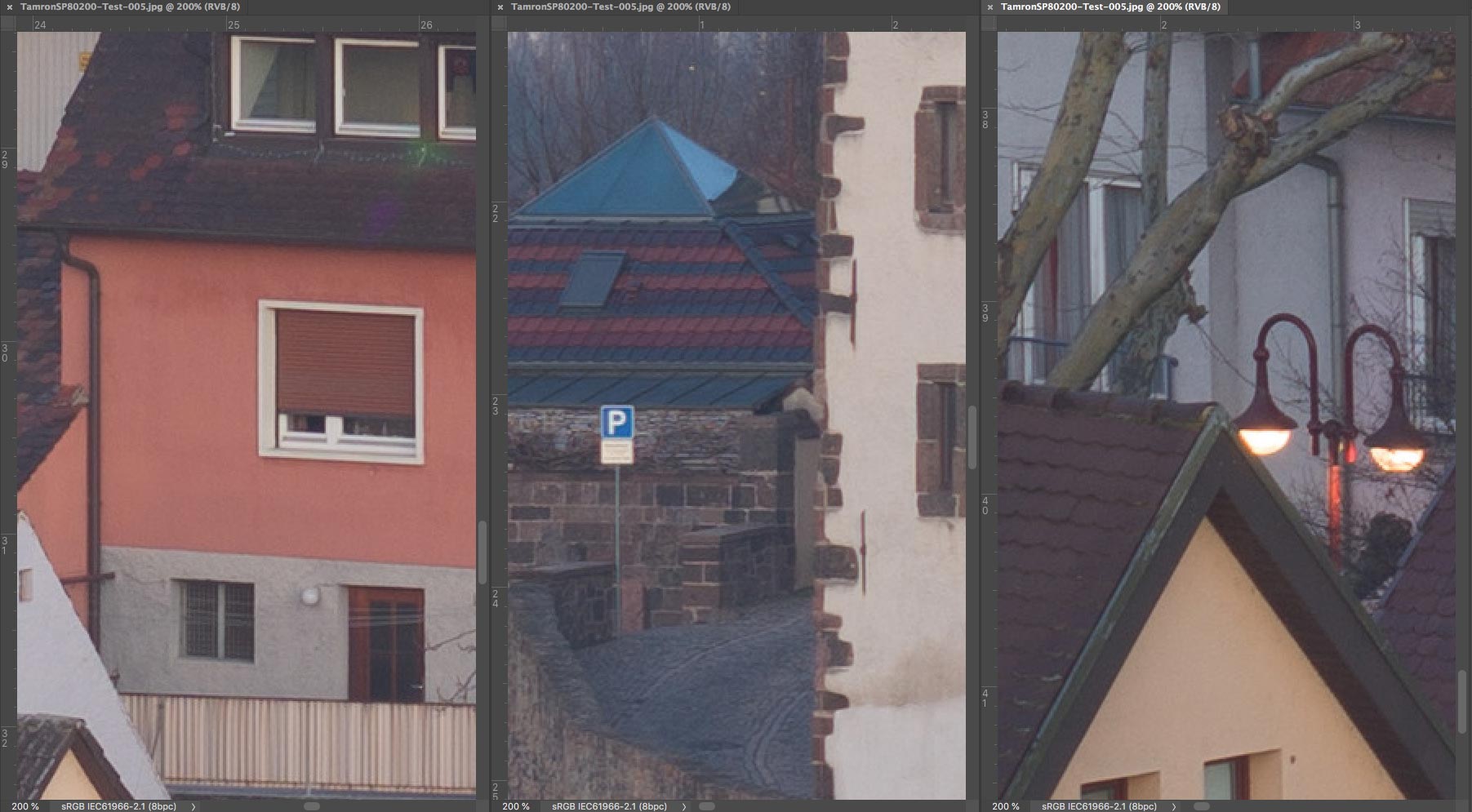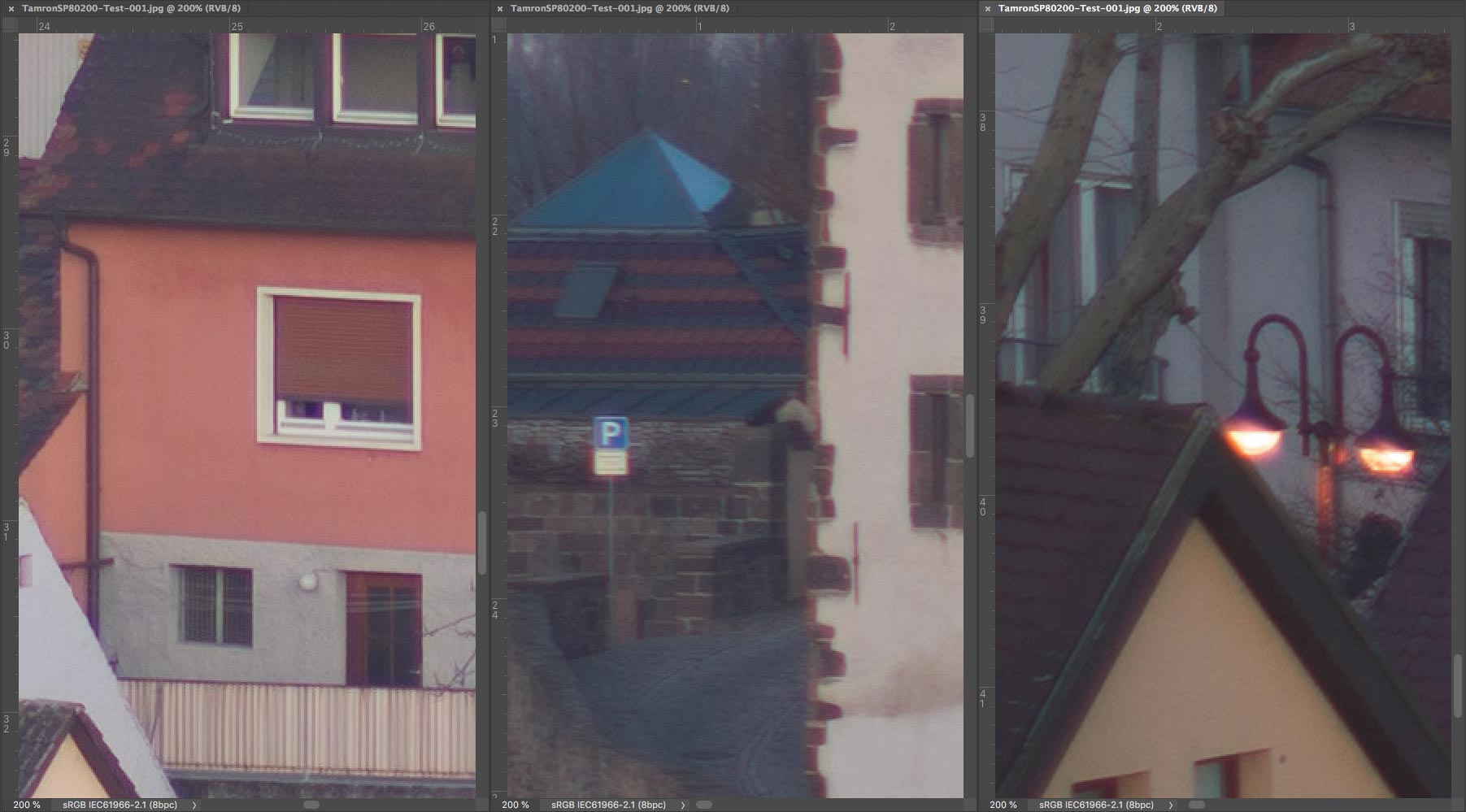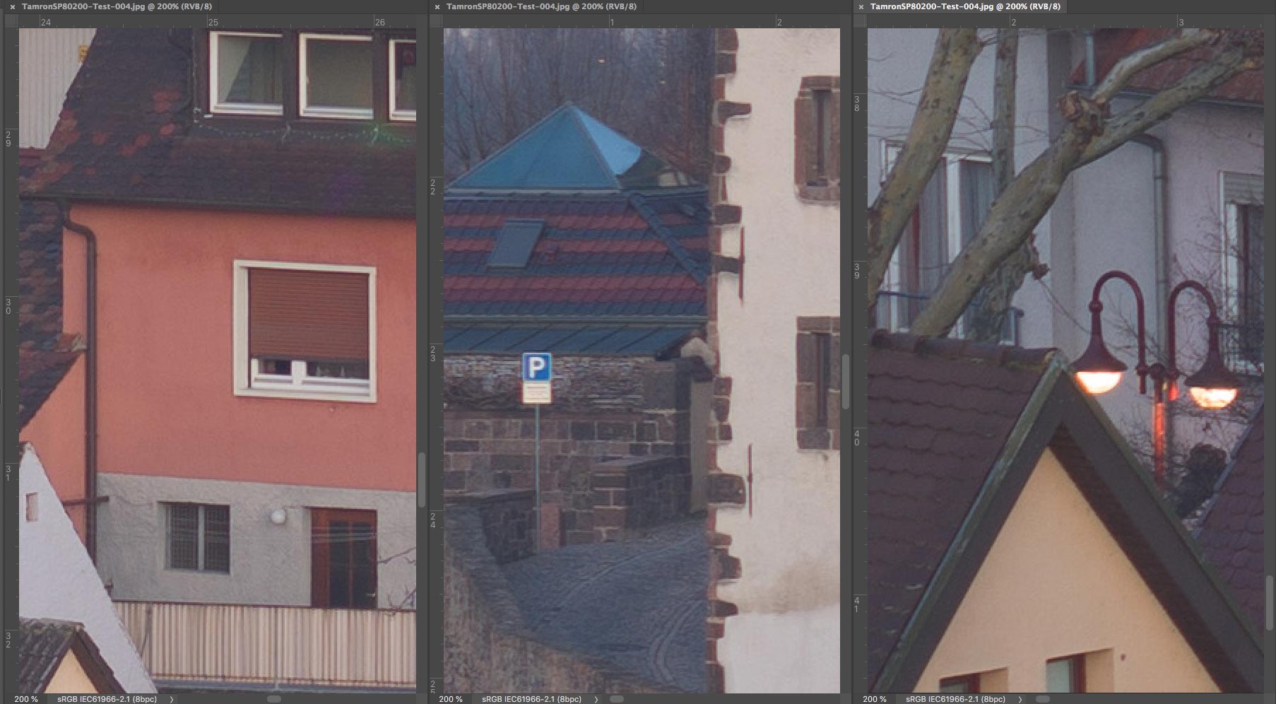 Um wieder zum Thema dieses Fadens zurückzukommen, habe ich auf die Schnelle das Tamron SP 80-200 mm f/2,8 LD mit dem sehr populären Tamron SP 70-210 mm f/3,5 (19AH) verglichen, das bis zum Ende der Neunziger Jahre im Sortiment der Adaptall 2-Objektive verblieb. Um die Unterschiede deutlicher zu machen, zeige ich hier nur das "Worst Case-Szenario", das heisst, die längste Brennweite, die bei Telezooms traditionell optisch am schlechtesten ist. Natürlich gibt es kleine Unterschiede in Sachen Bildausschnitt, denn beim Modell 19AH ist die Maximalbrennweite etwas länger. Die Scharfeinstellung erfolgte auf einen der weissen Fensterläden in der Bildmitte. Die Korrektur der chromatischen Aberrationen wurde in Camera Raw deaktiviert.