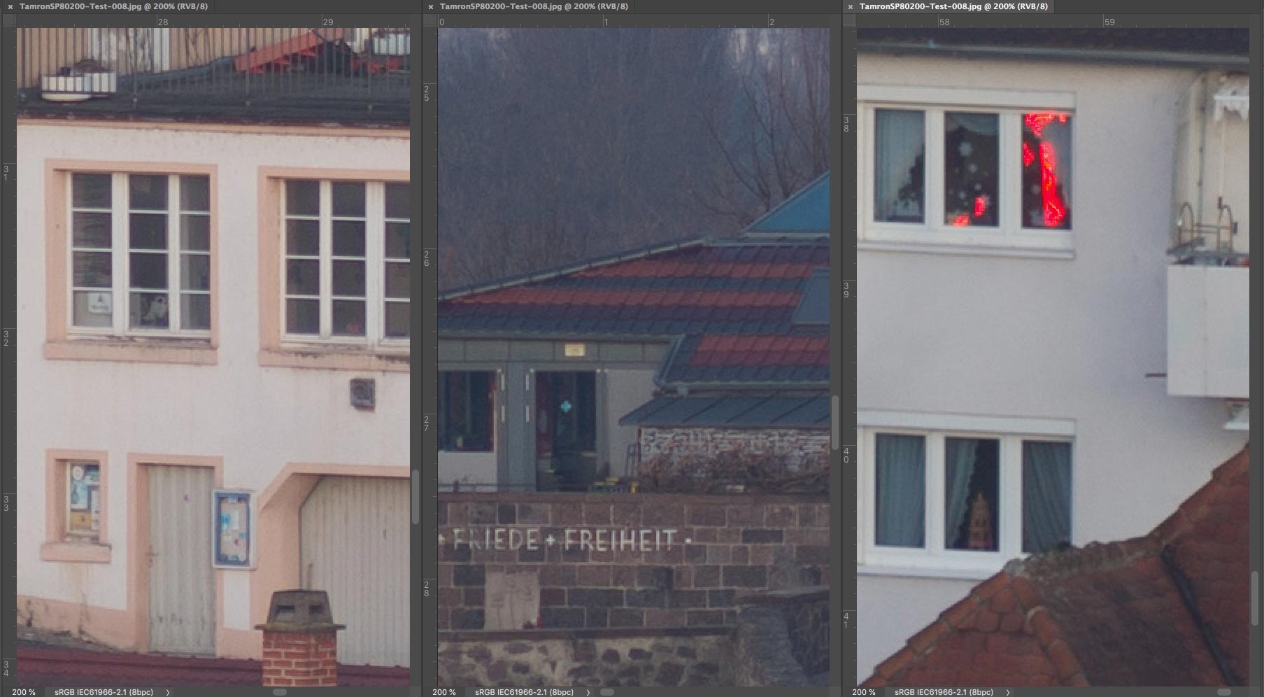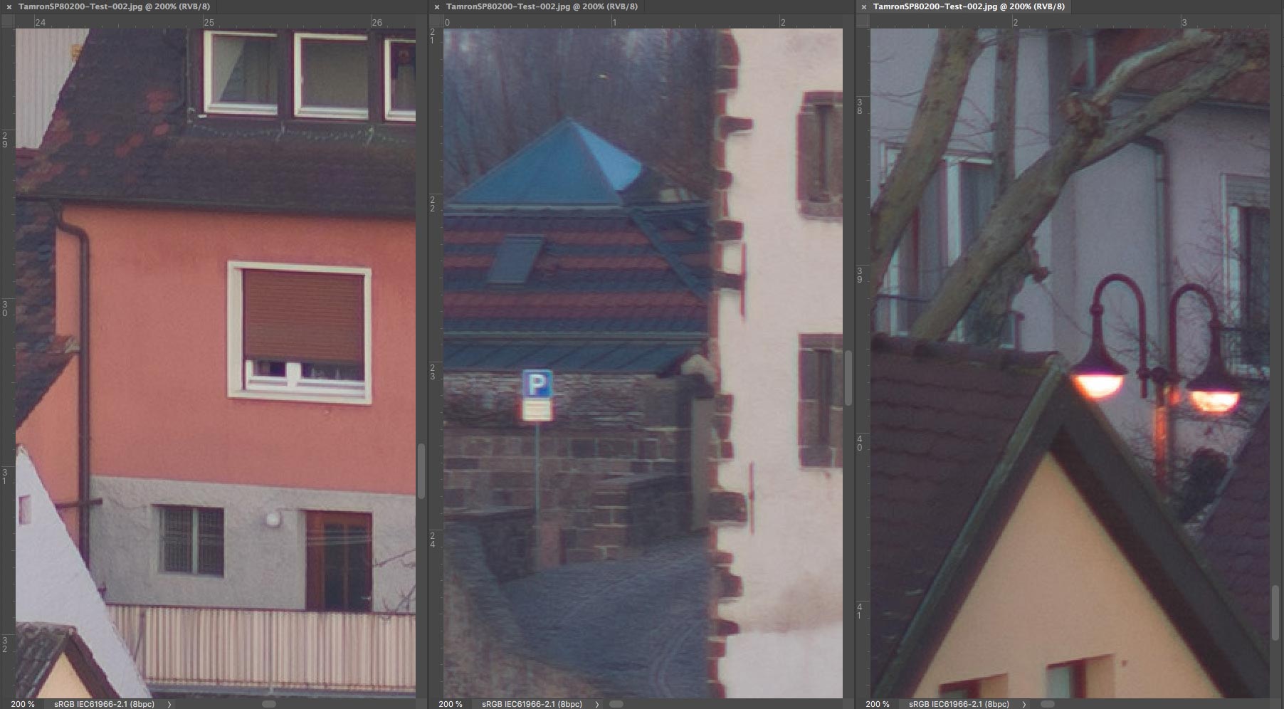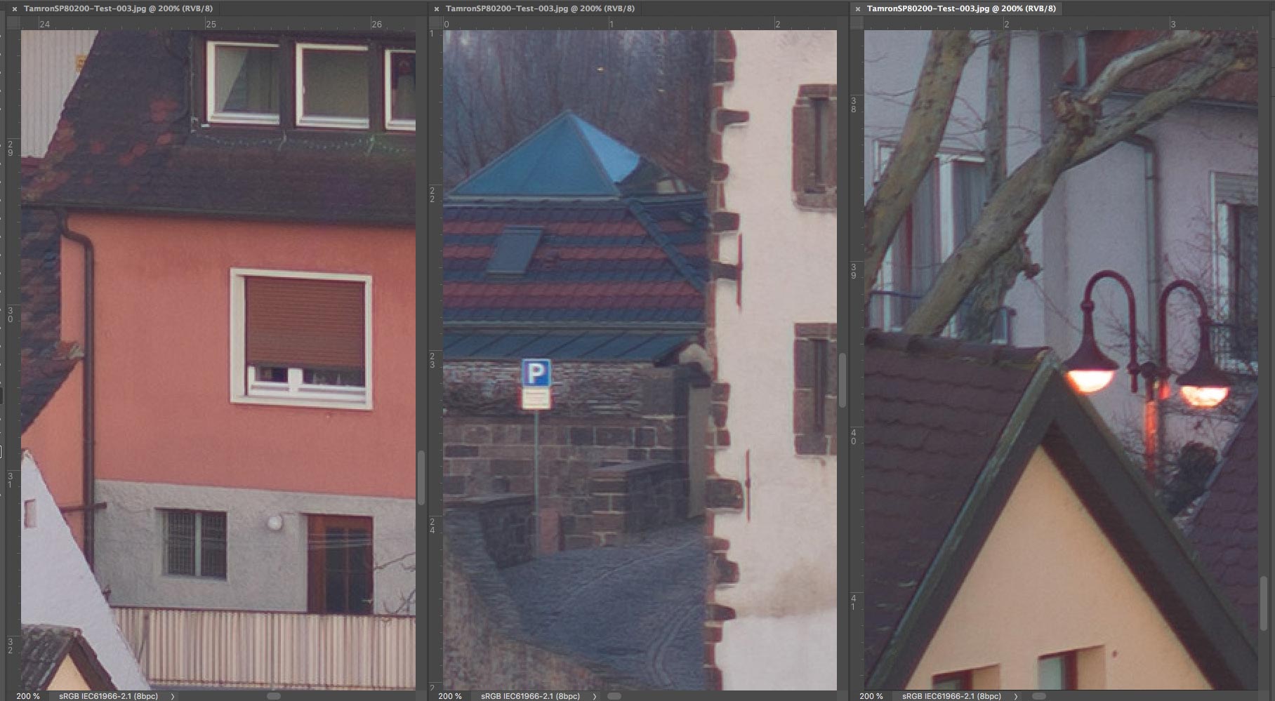 Um wieder zum Thema dieses Fadens zurückzukommen, habe ich auf die Schnelle das Tamron SP 80-200 mm f/2,8 LD mit dem sehr populären Tamron SP 70-210 mm f/3,5 (19AH) verglichen, das bis zum Ende der Neunziger Jahre im Sortiment der Adaptall 2-Objektive verblieb. Um die Unterschiede deutlicher zu machen, zeige ich hier nur das "Worst Case-Szenario", das heisst, die längste Brennweite, die bei Telezooms traditionell optisch am schlechtesten ist. Natürlich gibt es kleine Unterschiede in Sachen Bildausschnitt, denn beim Modell 19AH ist die Maximalbrennweite etwas länger. Die Scharfeinstellung erfolgte auf einen der weissen Fensterläden in der Bildmitte. Die Korrektur der chromatischen Aberrationen wurde in Camera Raw deaktiviert.