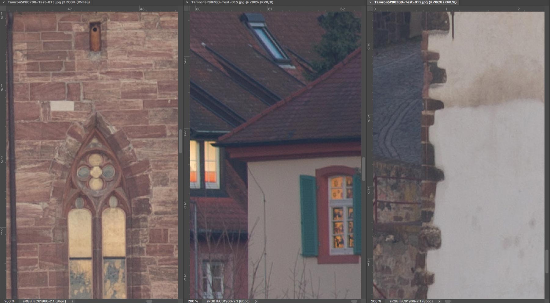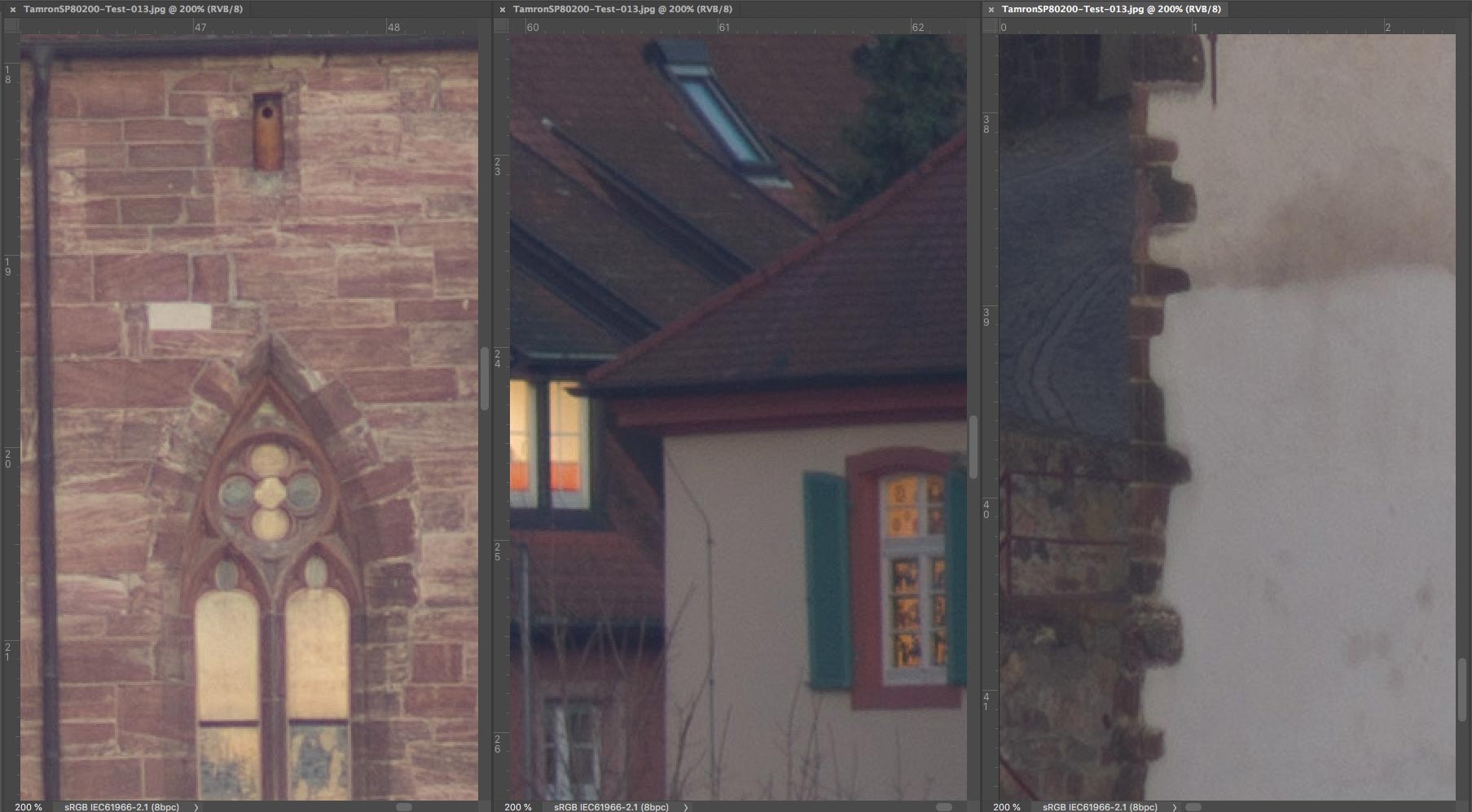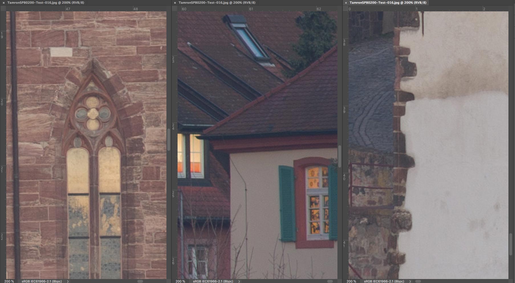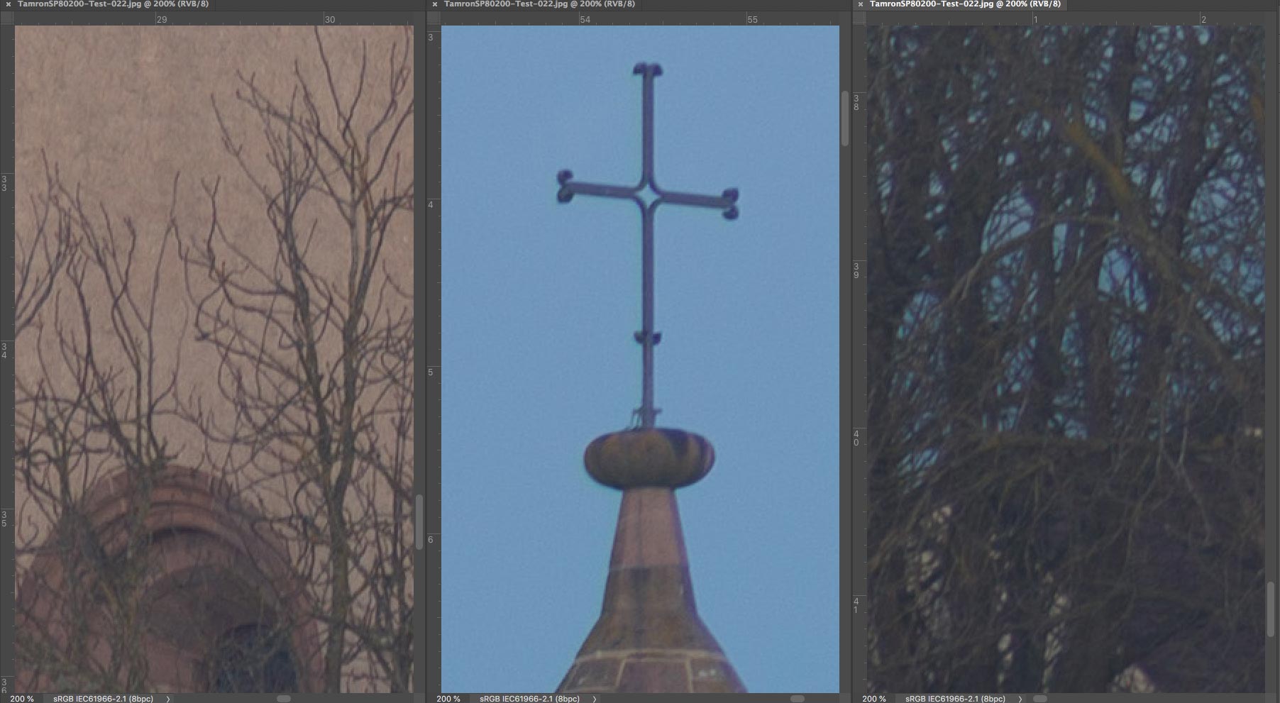 SP 80-200 mm f/2,8 LD - Ausschnitte 200% : Linke untere Ecke (links), Mitte (Mitte) und rechter oberer Bildrand (rechts)