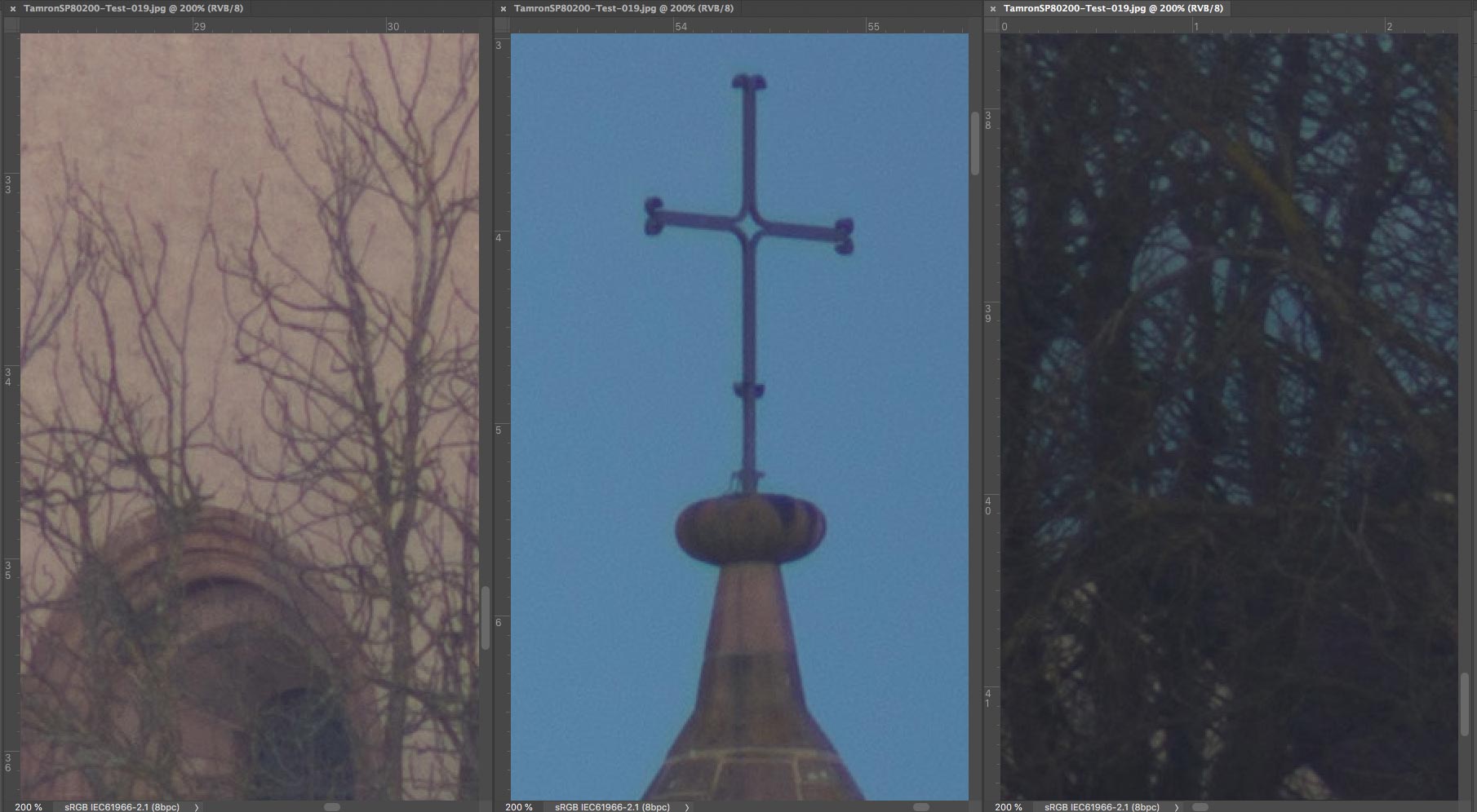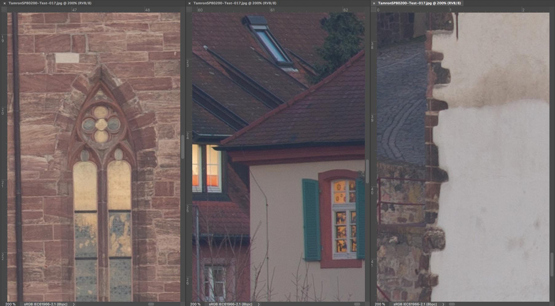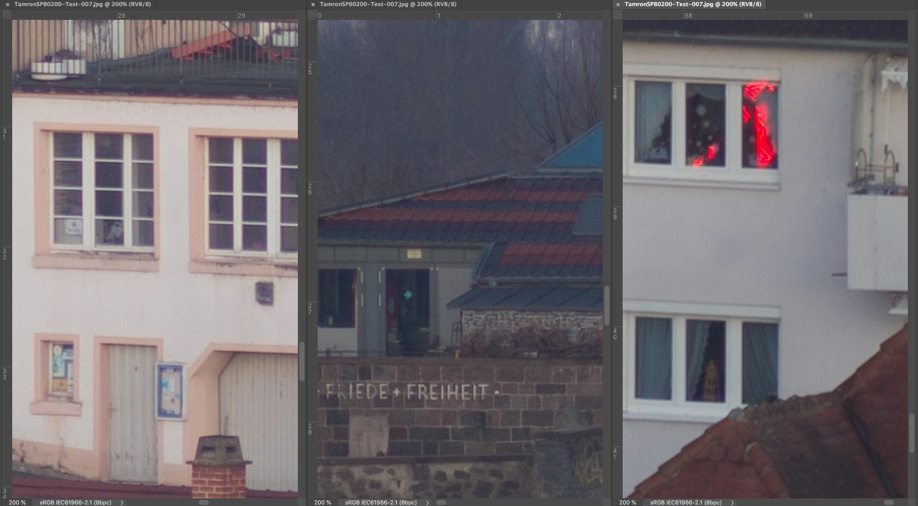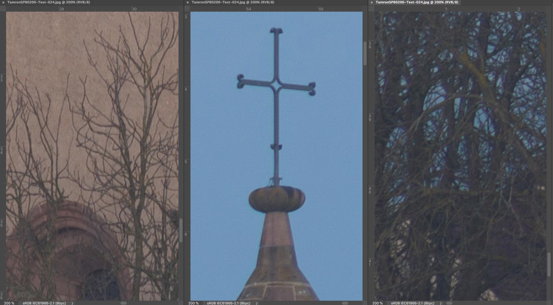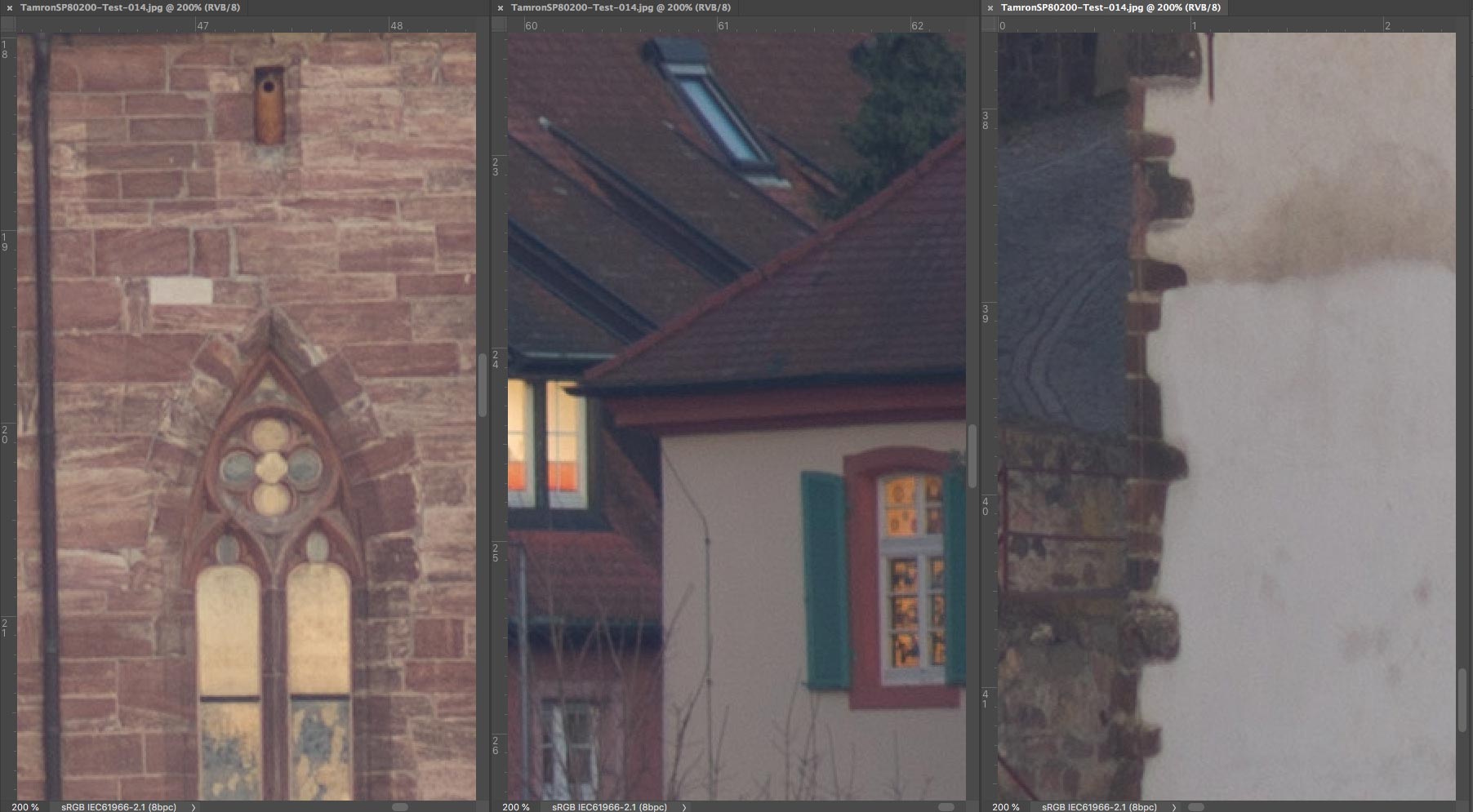 SP 80-200 mm f/2,8 LD - Ausschnitte 200% : Linke untere Ecke (links), Mitte (Mitte) und rechter oberer Bildrand (rechts)