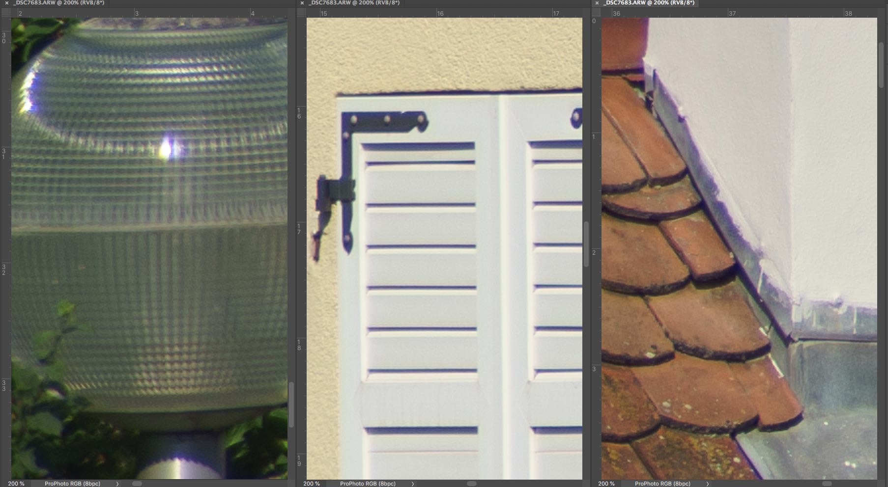 Wie bei mir üblich, wurden die Bilder mit Standardeinstellung in Camera Raw geschärft. Dabei habe ich die Übersichtsbilder bearbeitet, um die Randabschattung bei Offenblende deutlicher zu machen.
