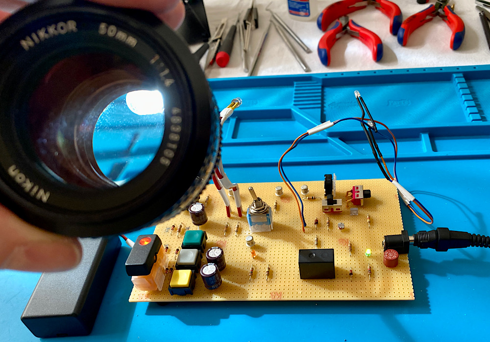 Superhelle weiße LED zum Durchleuchten von Objektiven. Durch automatische Zeitschaltung und Anschluss der LED auf der Platine bleibt die Hand frei.