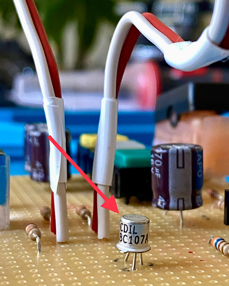 Neu auf der Platine: Transistor BC107A, der weniger Verstärkung hat.