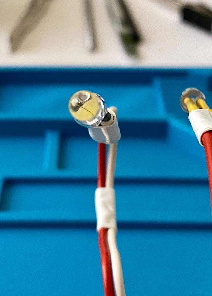 In den Schalter baute ich eine weiße matte 3-Millimeter-LED ein und lötete Anschlüsse für die Spannungsversorgung der LED und der extern anzuschließenden Last: