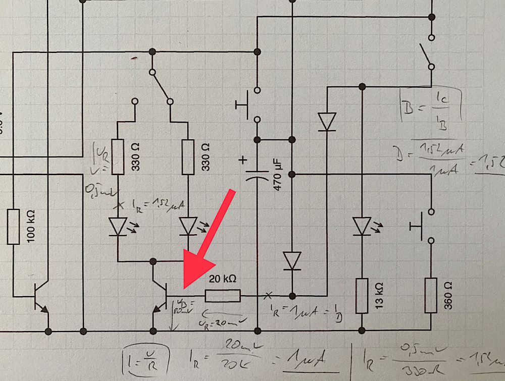 Statt der höchsten Verstärkungsklasse „C“ schaltet jetzt ein BC107A die Superhellen. Dieser muss mit mehr Strom angesteuert werden, damit er durchschaltet.