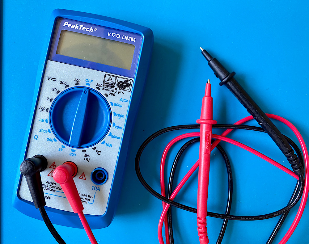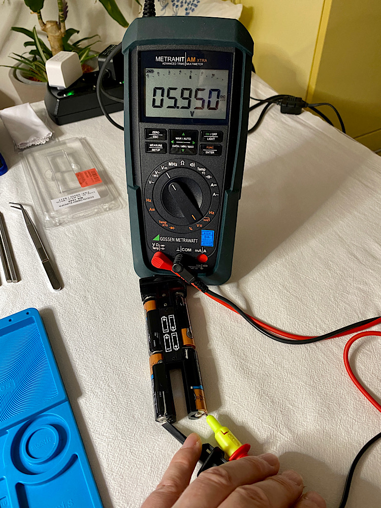 Zum Messen der Gesamtleerlaufspannung der Batterien im Batteriehalter nutze ich dieses kleine und solide Multimeter. Es ist sogar ein Aufsatz zum Temperaturmessen dabei. Kosten unter EUR 20,- glaube ich: