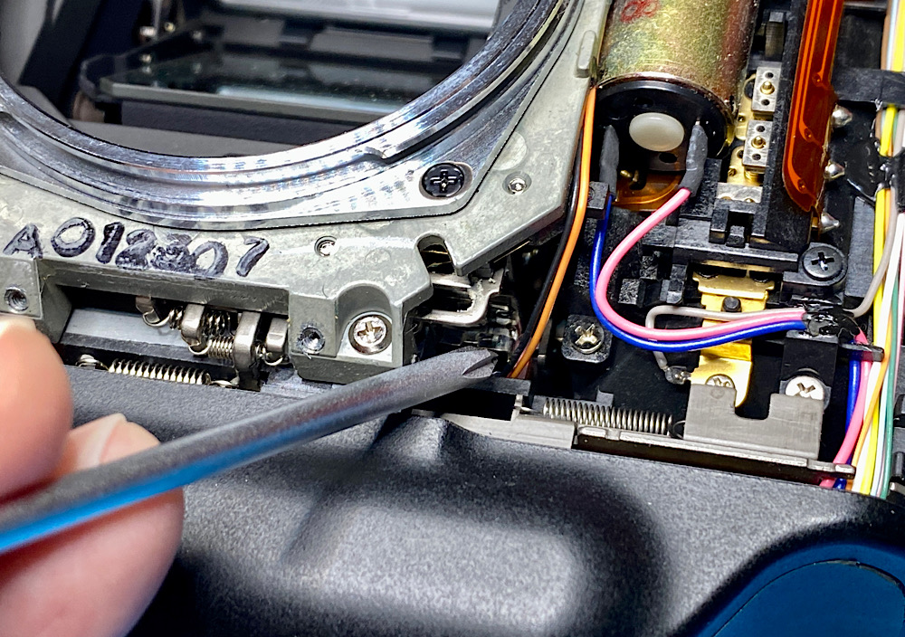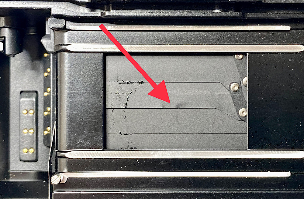 - Reste eines Dämpfers, der sich im Bereich des Verschlusses zersetzt, und die die Rollos des Copal-S(quare)-Verschlusses verkleben. Der gefürchtete Fehler „EEE“ erscheint auf dem Display.