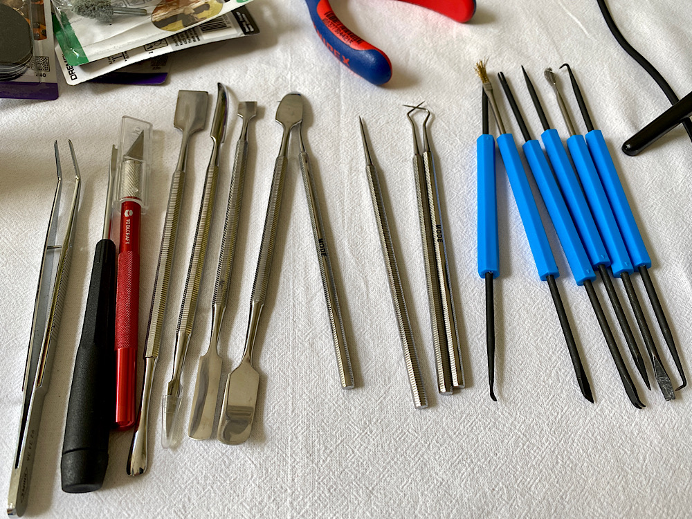 Pinzetten in verschiedenen Größen, ein Entlöthebel, scharfes Messer, Werkzeuge zum Schaben und Hebeln, Sonden und Platinenwerkzeug sind für feines Arbeiten Voraussetzung: