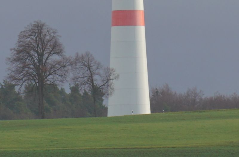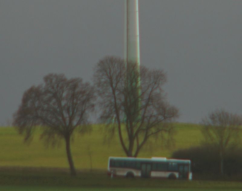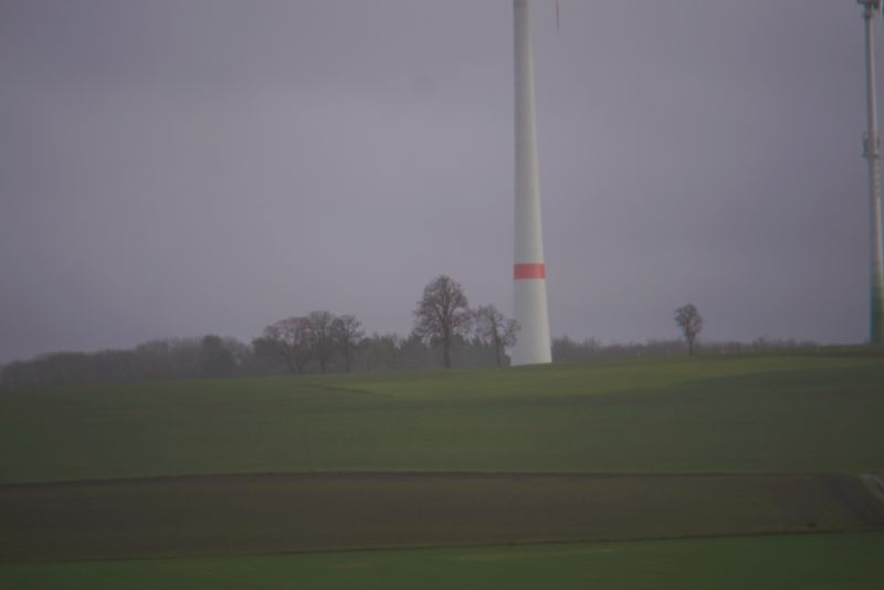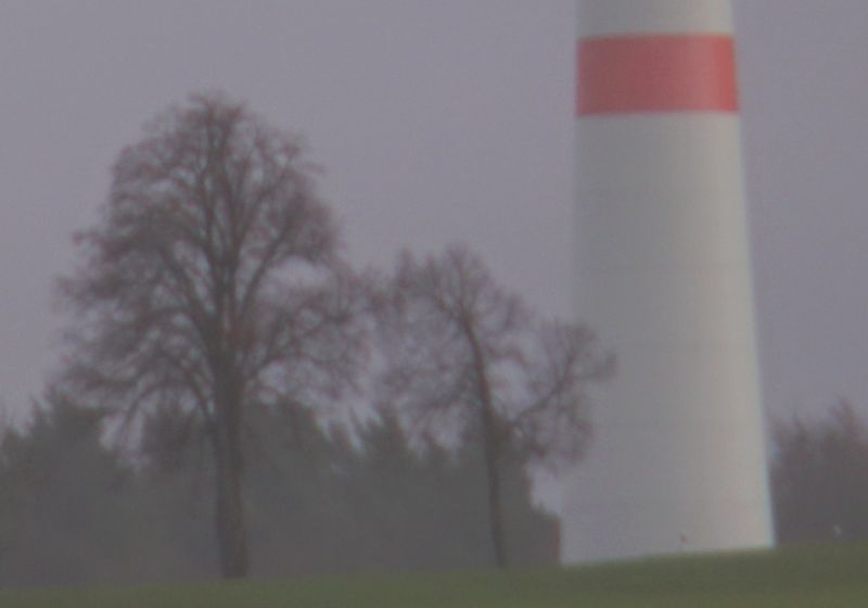 was soll ich sagen, das Teil kriegt kein scharfes Bild zustande. Unendlich geht gar nicht, dafür extremer Nahbereich. Ich vermute, dass der Zusammenbau nicht richtig geklappt hat, nachdem das Objektiv ja leider schon verbastelt bei mir angekommen ist und der Reparaturbetrieb sein Bestes gegeben hat es wieder zusammen zu bekommen. Ich wollte Unendlich an meinem "Prüf-Windpark" testen, keine Chance.