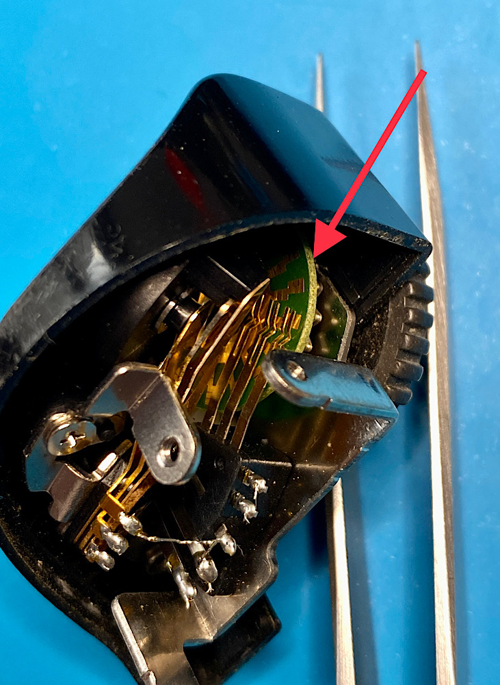 Das Drehrad bewegt die runde Kontaktescheibe, feine Kontaktfühler gleiten darüber.