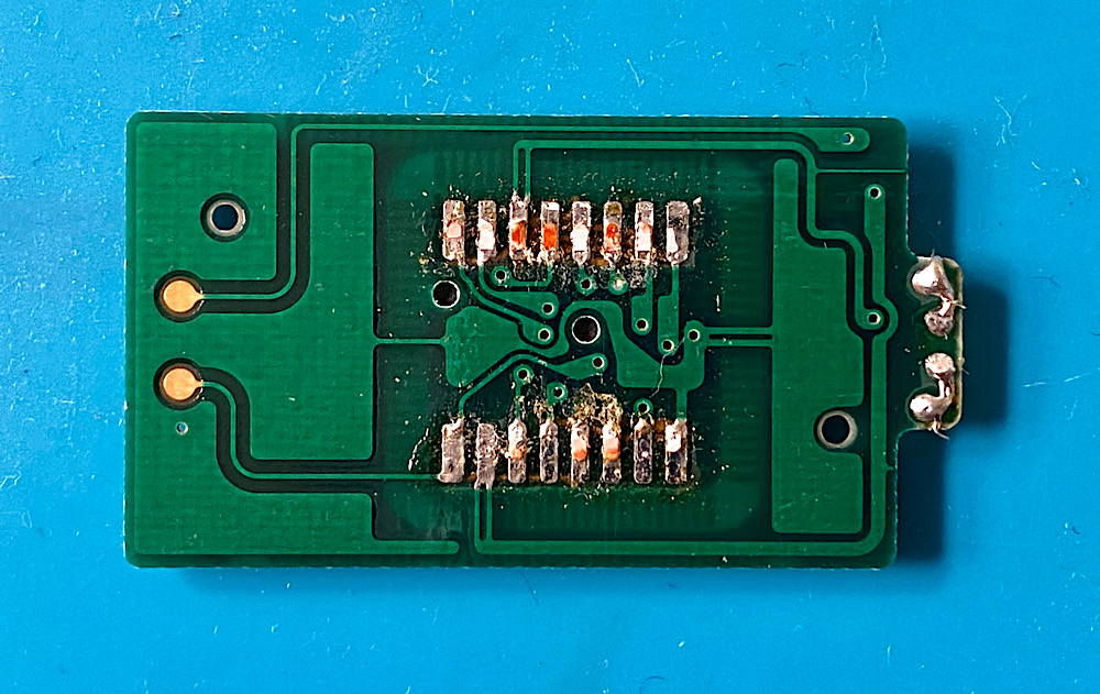 Der Bereich um den IC sieht fehlerfrei aus. Von der Unterseite löste ich beim Austausch der Displayeinheit den Anschluss zur flexiblen Leiterplatine ab, daher die Entlötspuren.