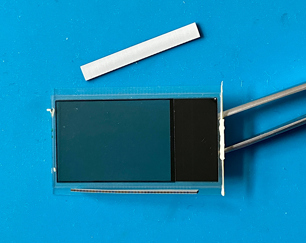 Das Display das über zwei Leitgummistreifen mit der Platine verbunden ist.