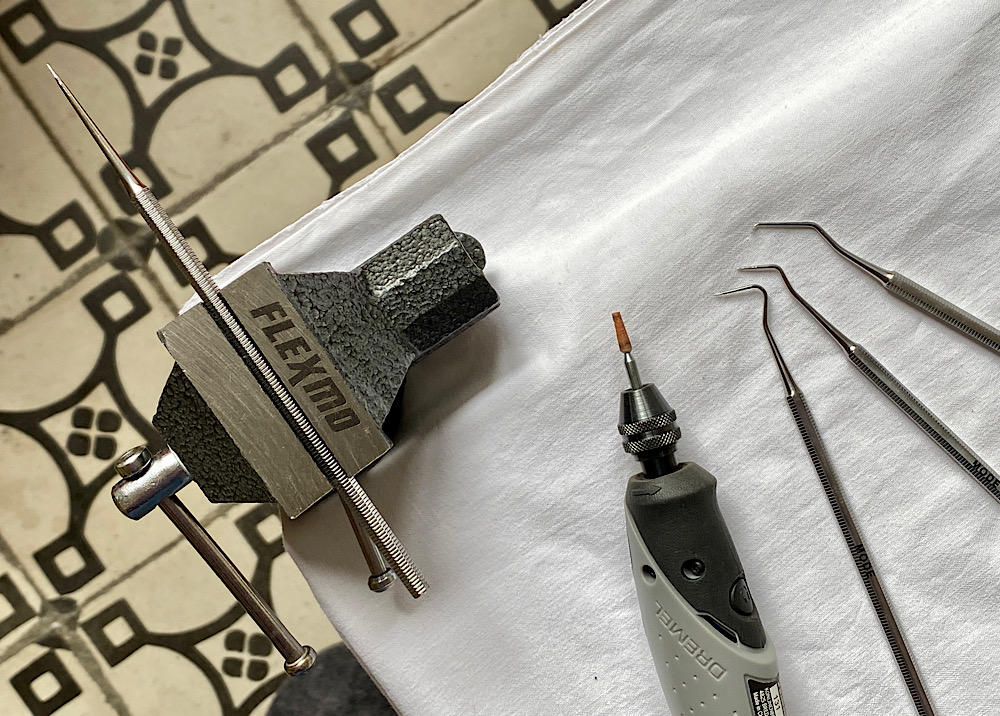Bei dieser Gelegenheit schärfte ich die schon weich gewordenen und verbogenen Spitzen meiner Sonden mit dem Dremel Stylo nach.