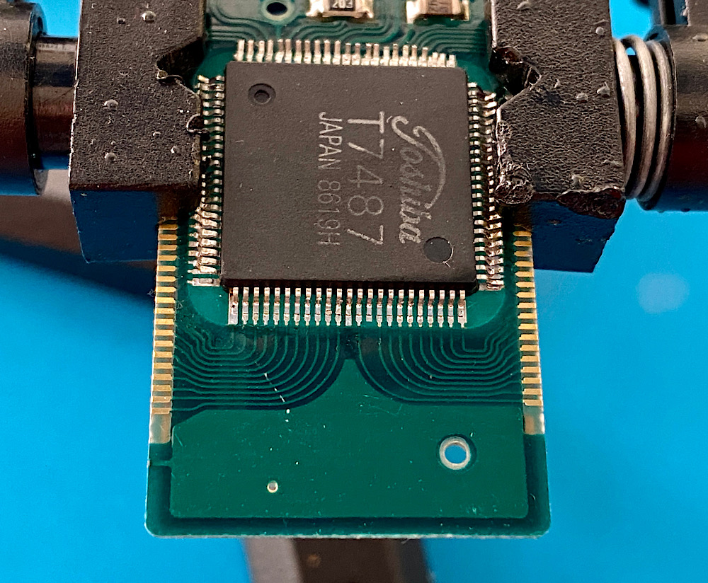 Als Kandidaten für den Versuch mussten der mutmaßlich defekte IC und seine Platine herhalten, die ich unlängst aus einer T90 mit Displayfehler herausgeholt hatte.