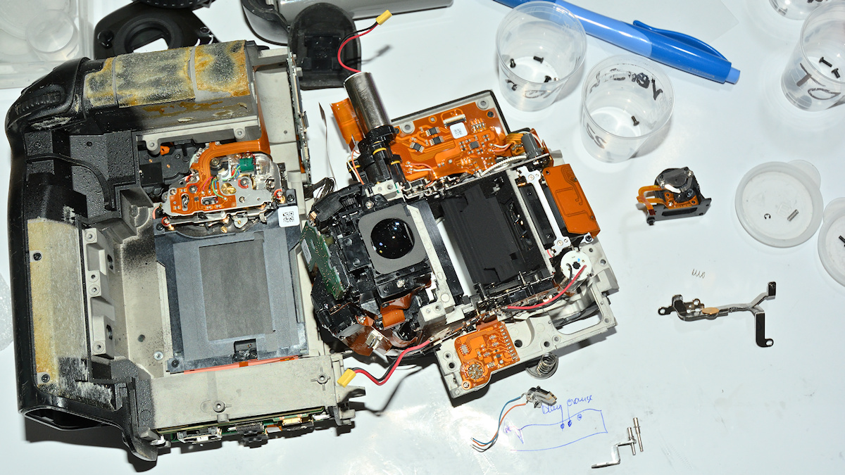 Also die Kamera so weit wie nötig zerlegt und den Entrigelungshebel, in den der Stift verpresst ist, ausgebaut: