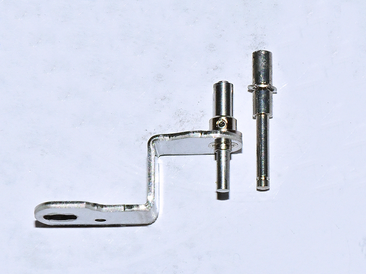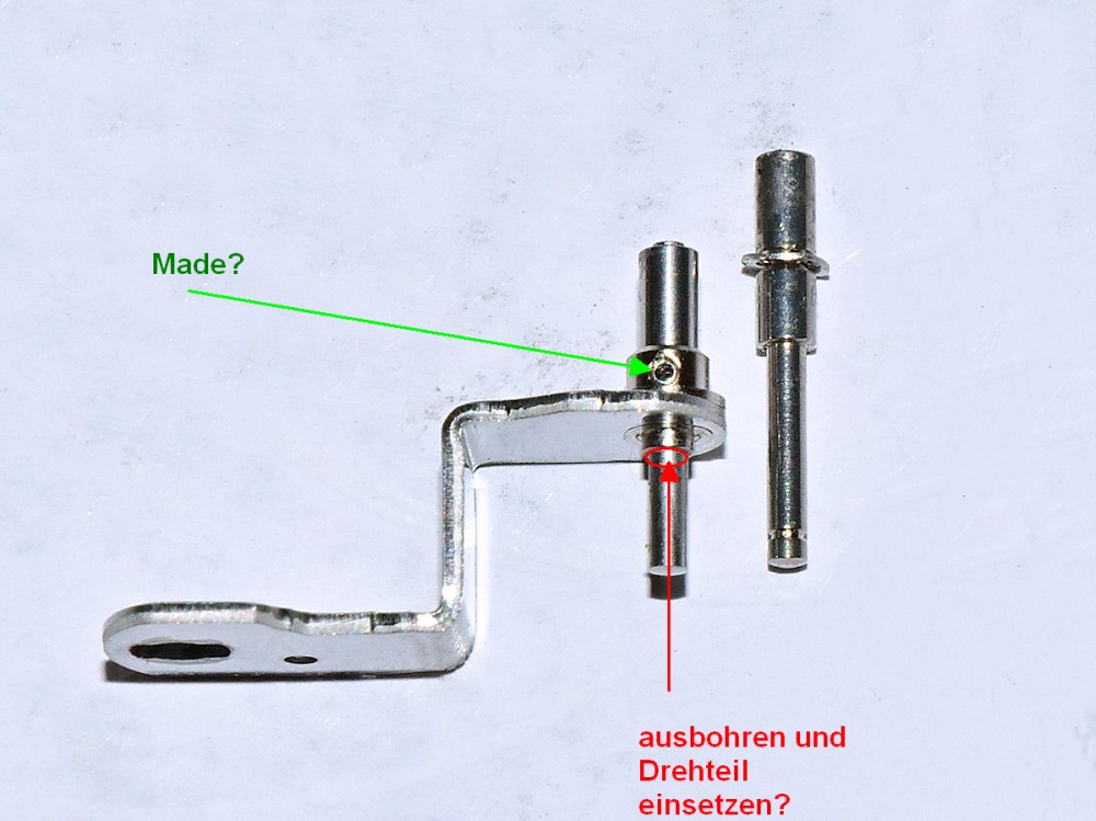Nun sieht man auch das eigentliche Problem: Der "Ersatzstift" ist zwar annähernd so lang wie der ursprüngliche mal war, sein "dickerer" Teil ist aber kürzer. Somit wird es schwierig, den in die Buchse auf dem Winkelhebel senkrecht zu befestigen.