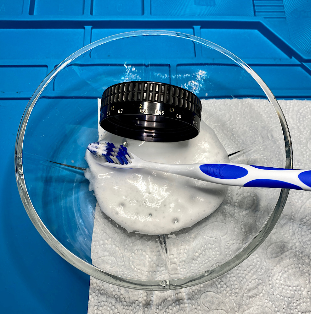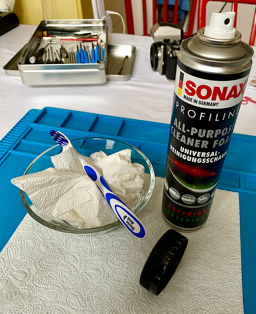 In mehreren Durchgängen spüle ich die Helicoide mit Feuerzeugbenzin und drehe den Fokusring etliche Male von Anschlag zu Anschlag.