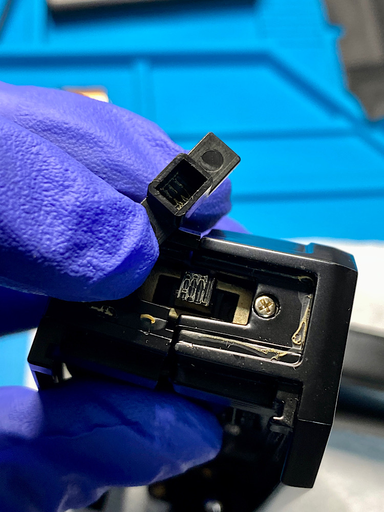 Auch gab es hier ein Problem mit Korrosion. Batteriesäure beschädigte einen der beiden Kontakte im Batteriefach. Die Erfahrung lehrt, dass es hinter den Kontakten mit dem Säuretreiben gerne weitergeht, oft übler, als vorne am Kontakt, wo man das Problem angehen kann.