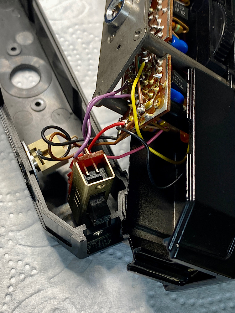 Nun ist der untere Gehäuseteil nur mehr über die Verkabelung der Buchse und eine Schraube am Betriebsmodusschalter verbunden.