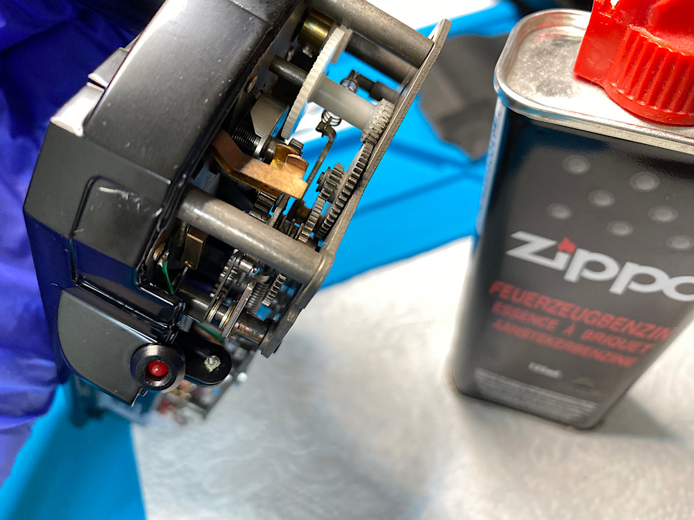 So kommt Zippo Feuerzeugbenzin in maßvoller Menge auf die Zahnräder aus Metall, um die Schmierungsreste aufzulösen. Anschließend bewege ich das Getriebe, damit sich der Sprit verteilt.
