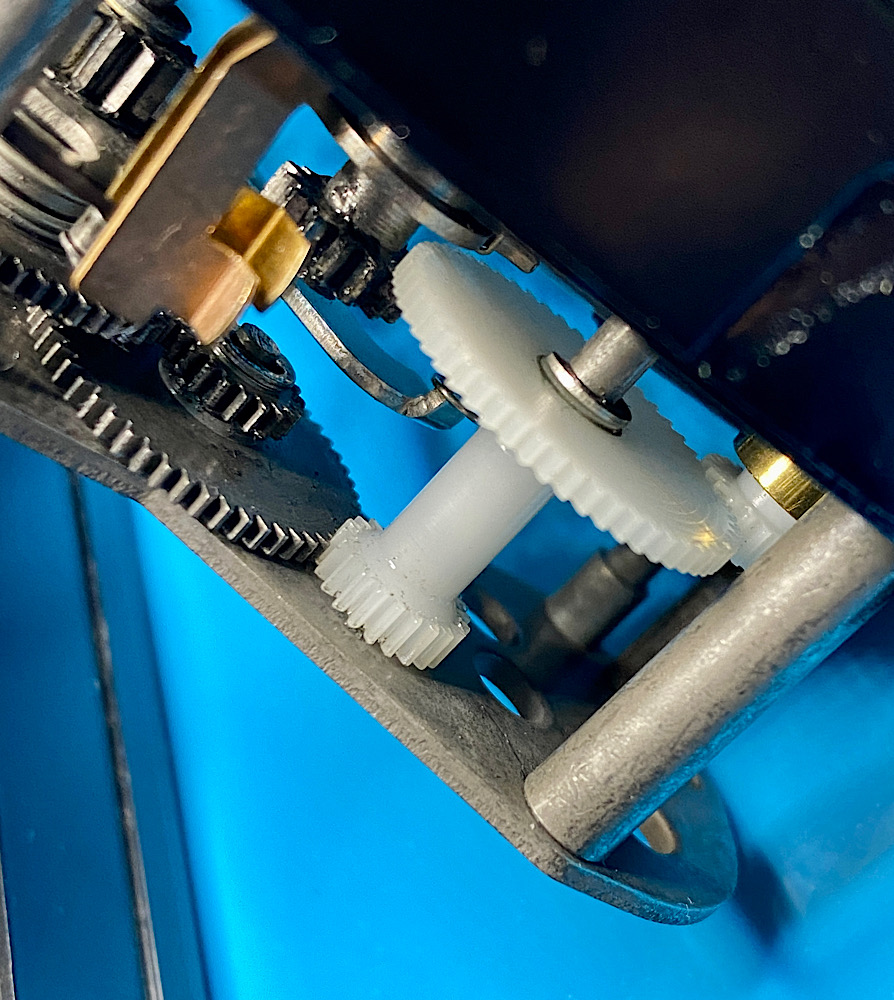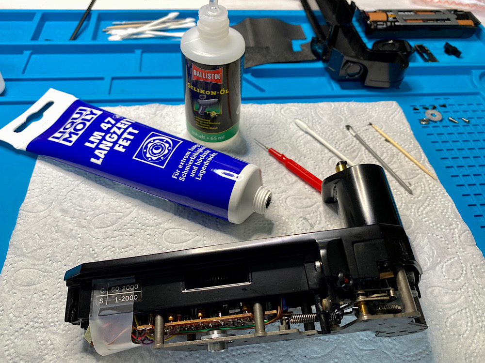 Die Zahnräder aus Kunststoff bekommen Ballistol-Silikonöl. Ebenso alle erreichbaren Achsen und Drehpunkte. Auch, wenn es durch den Verbau nicht viele sind..