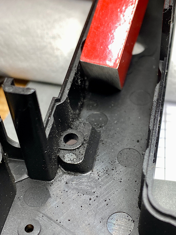 Prüf' doch mal, ob die "Krümel" an einem Magneten haften oder nicht. Und lieber keinen Alkohol an die Kunststoffzahnräder. Vermutlich sind die aus Nylon (Polyamid) oder Delrin (POM) und dann solllllte Alkohol kein Problem sein, aber man weiß ja nie.