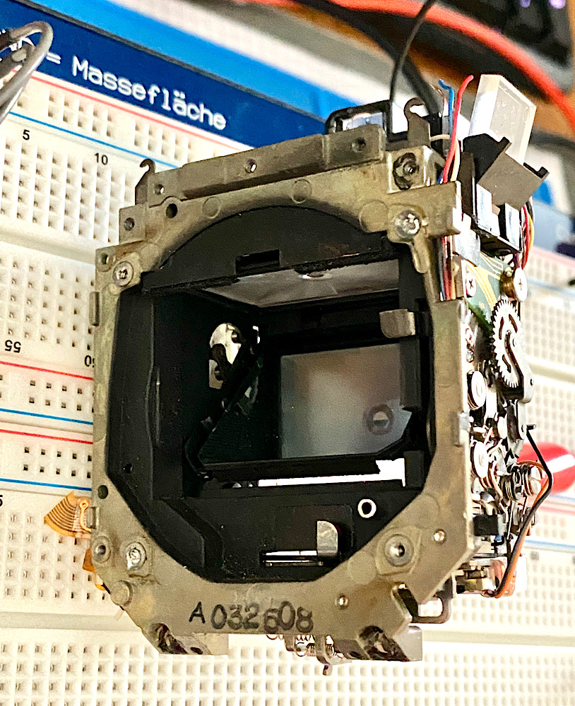 Spiegel und Verschluss werden durch ein Federsystem über einen speziellen Motor belastet und über elektromagnetische Systeme, d. h. Magnetspulen, die einen Haltemechanismus auslösen, freigegeben.