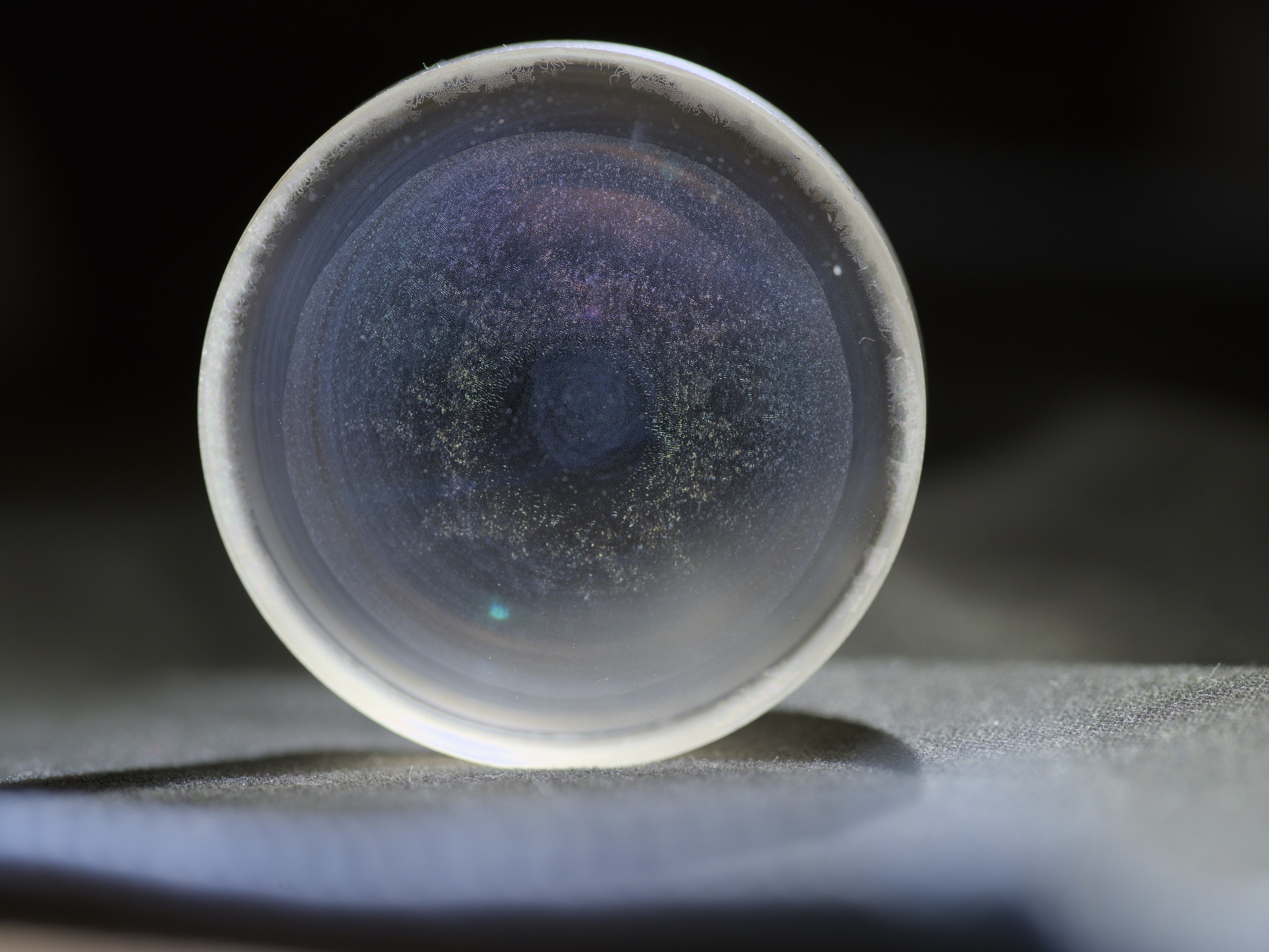 Epoxidkleber zu trennen ist nicht ganz einfach. In der Literatur findet man etwa heißes Dimethylsufloxid(DMSO) [1] oder eine Kombination aus DMSO und N-Methyl-Pyrrolidon (NMP) [2] als effektive Lösungsmittel. Ein Hausmittel ist eine Mischung aus Aceton und Iso-Propanol. Ich habe es mit dem Hausmittel probiert. Nach einer Woche sah die Linse so aus: