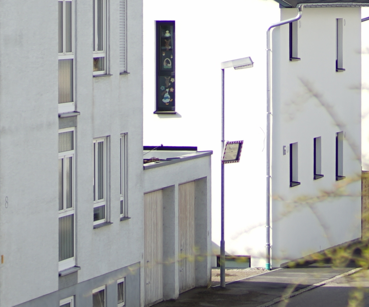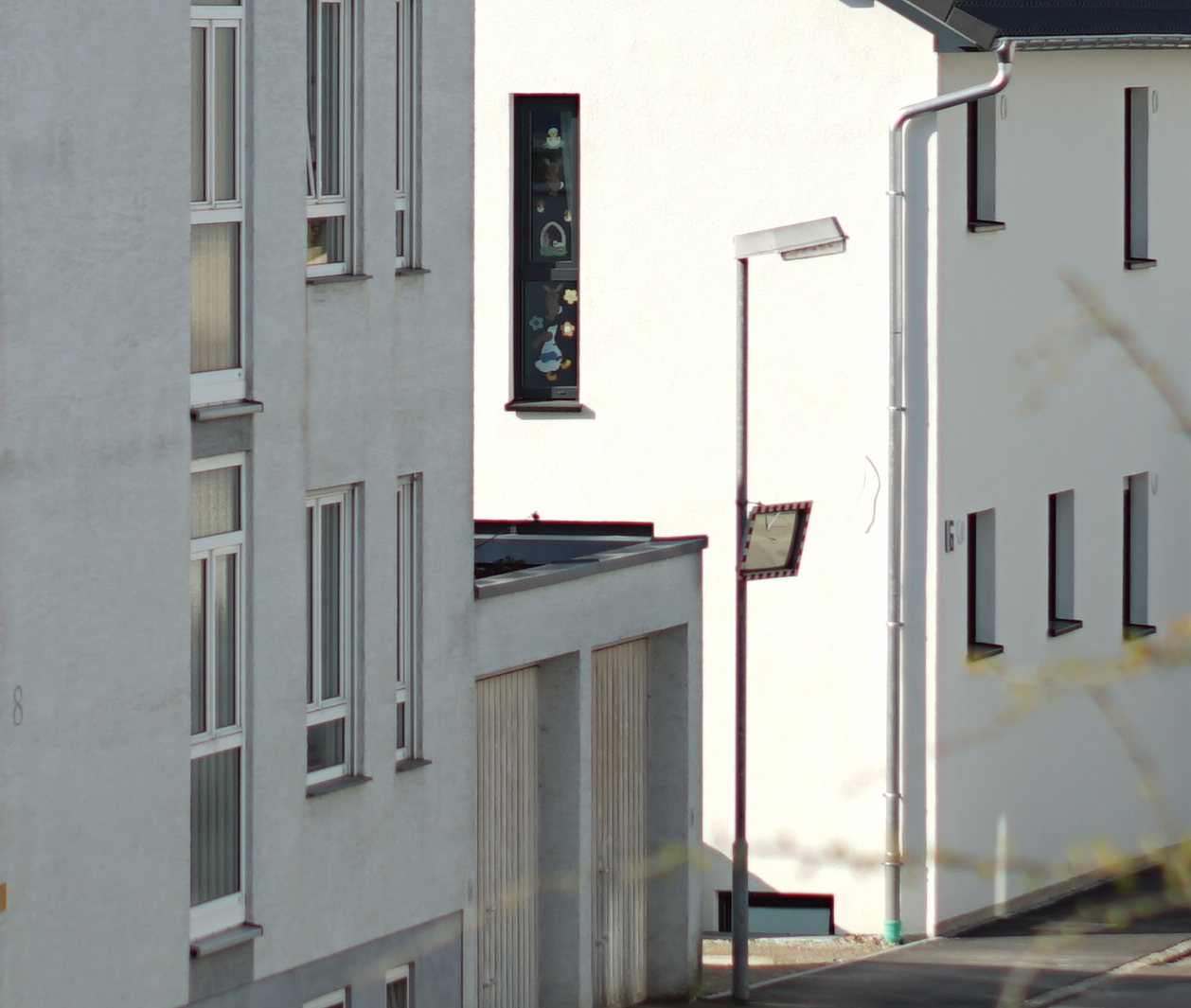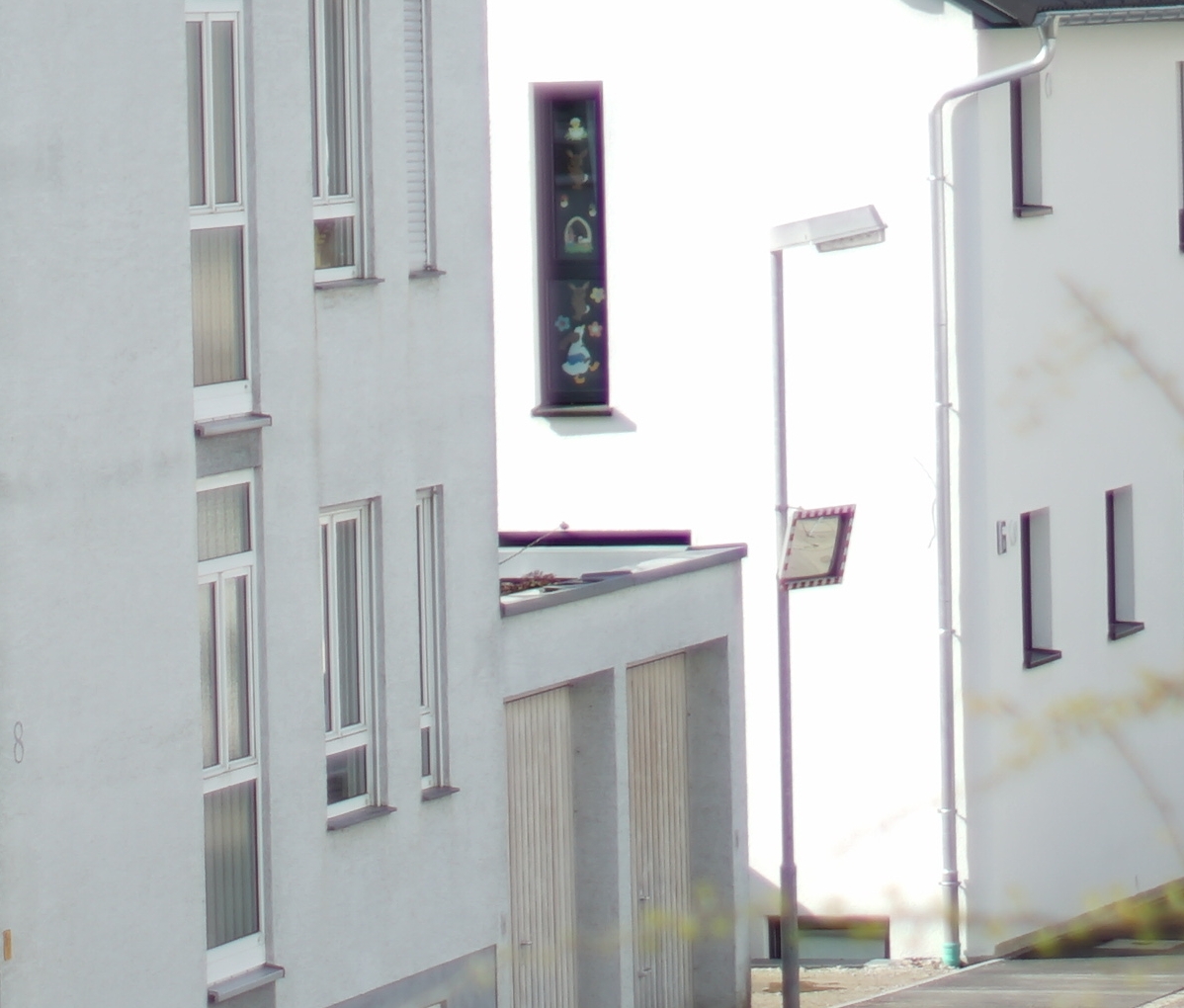 Hier nun die Bildmitte mit der weißen Hauswand (Ausschnitte aus den unbearbeiteten jpgs). Fokussiert habe ich auf die Straßenlaterne, Offenblende.