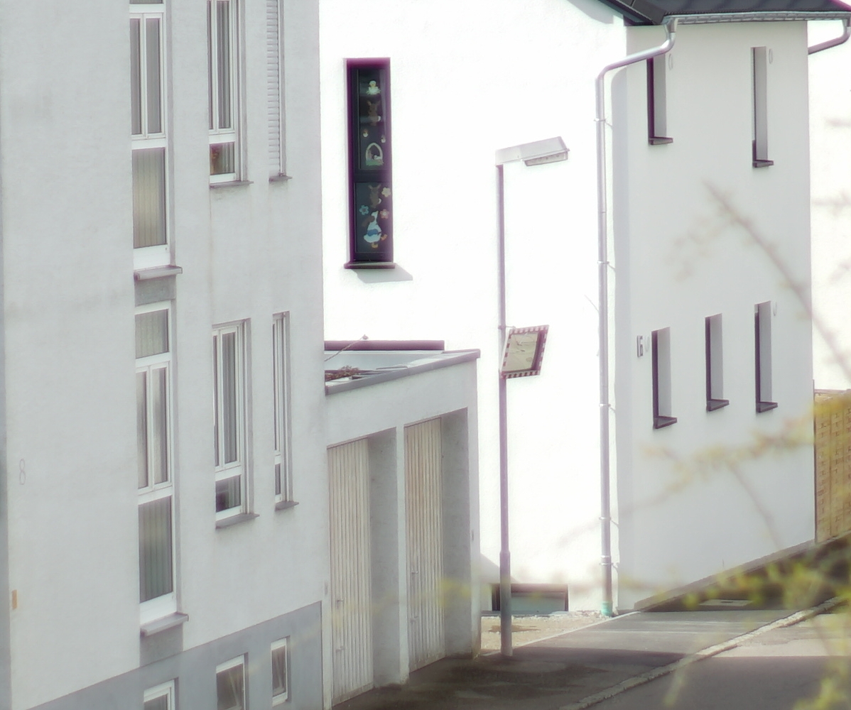 CAs fallen bei allen 3 Objektiven auf: am Fenster in der weißen Fläche, im oberen schrägen Teil des Dachrinnen-Rohrs (beim MC Rokkor am geringsten) und insbesondere am Laternenmast. Im unteren Teil des Laternenmasts fallen die CAs beim Syoptic zunächst am wenigsten ins Auge, da hier ein sehr dunkles Lila vorherrscht. Die Helligkeit des Bildes beeinflusst wohl die Wahrnehmung der CAs.