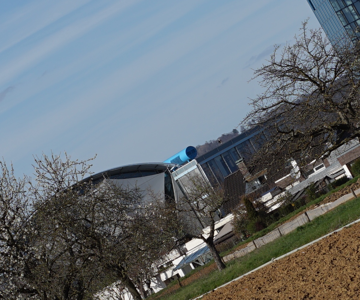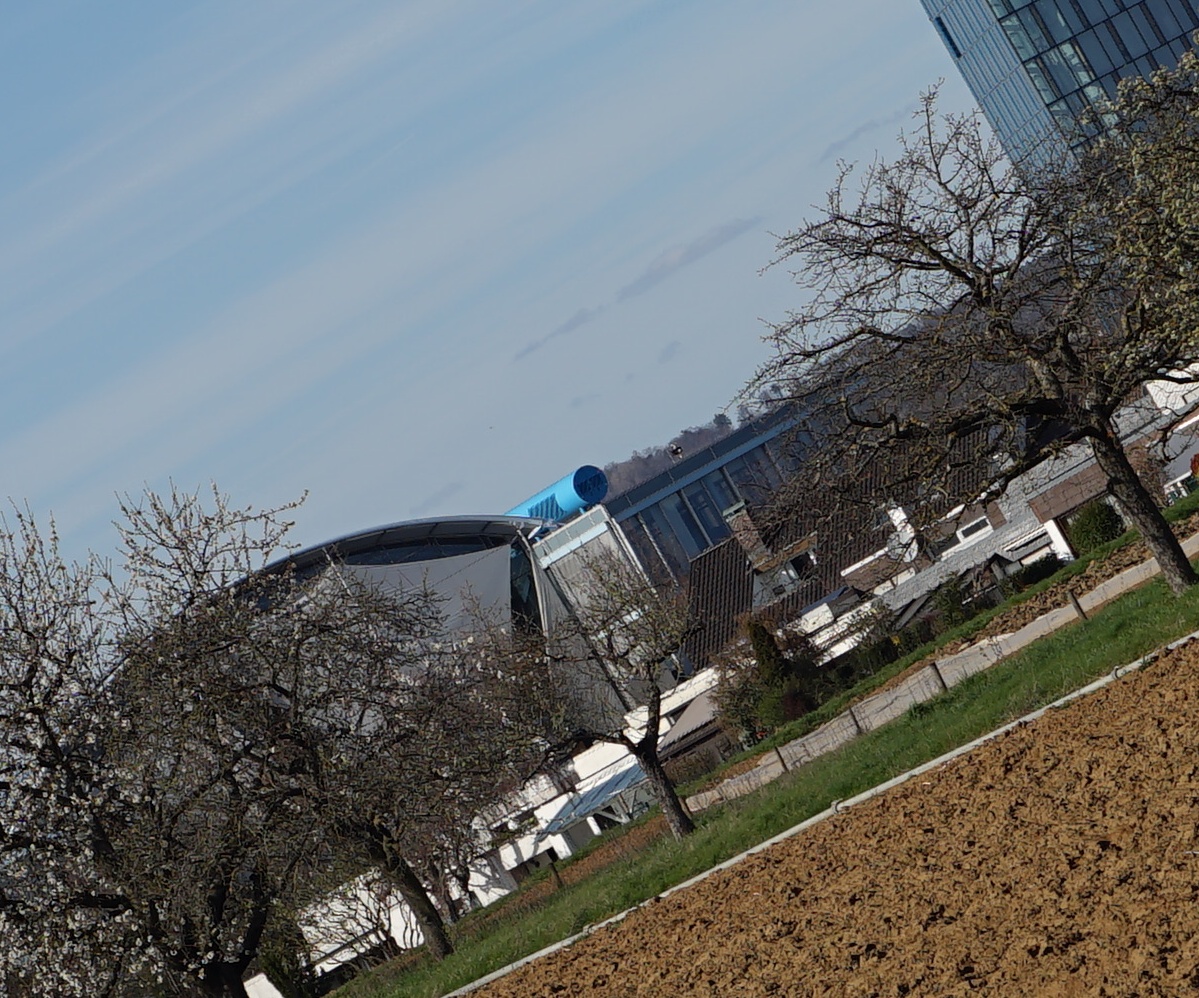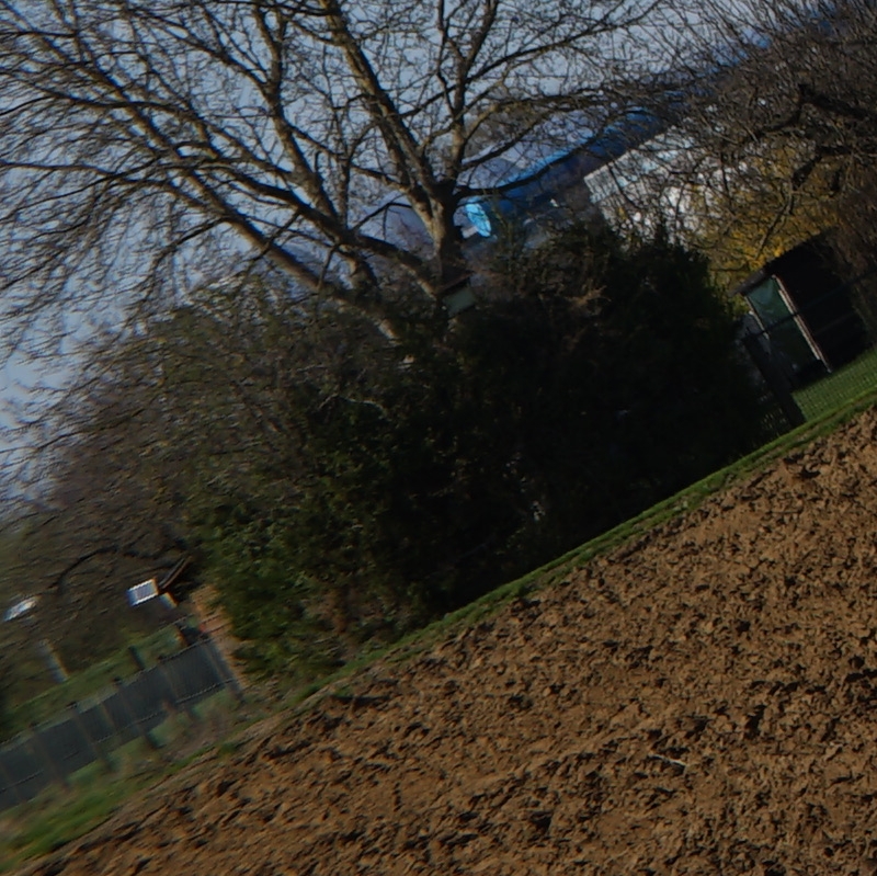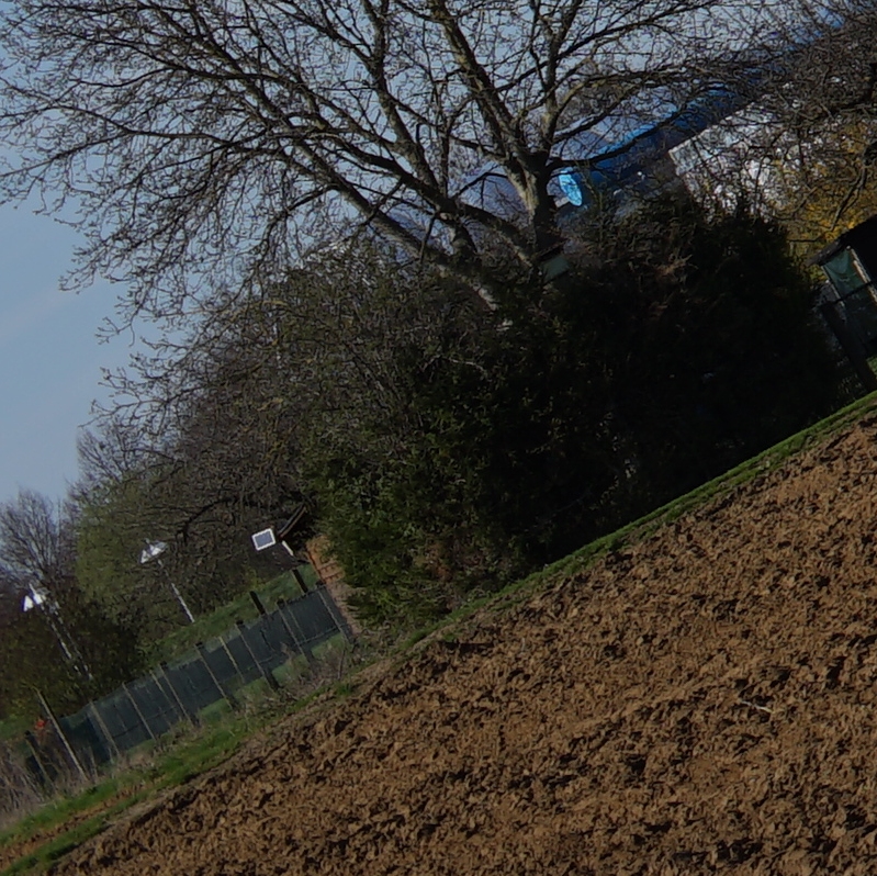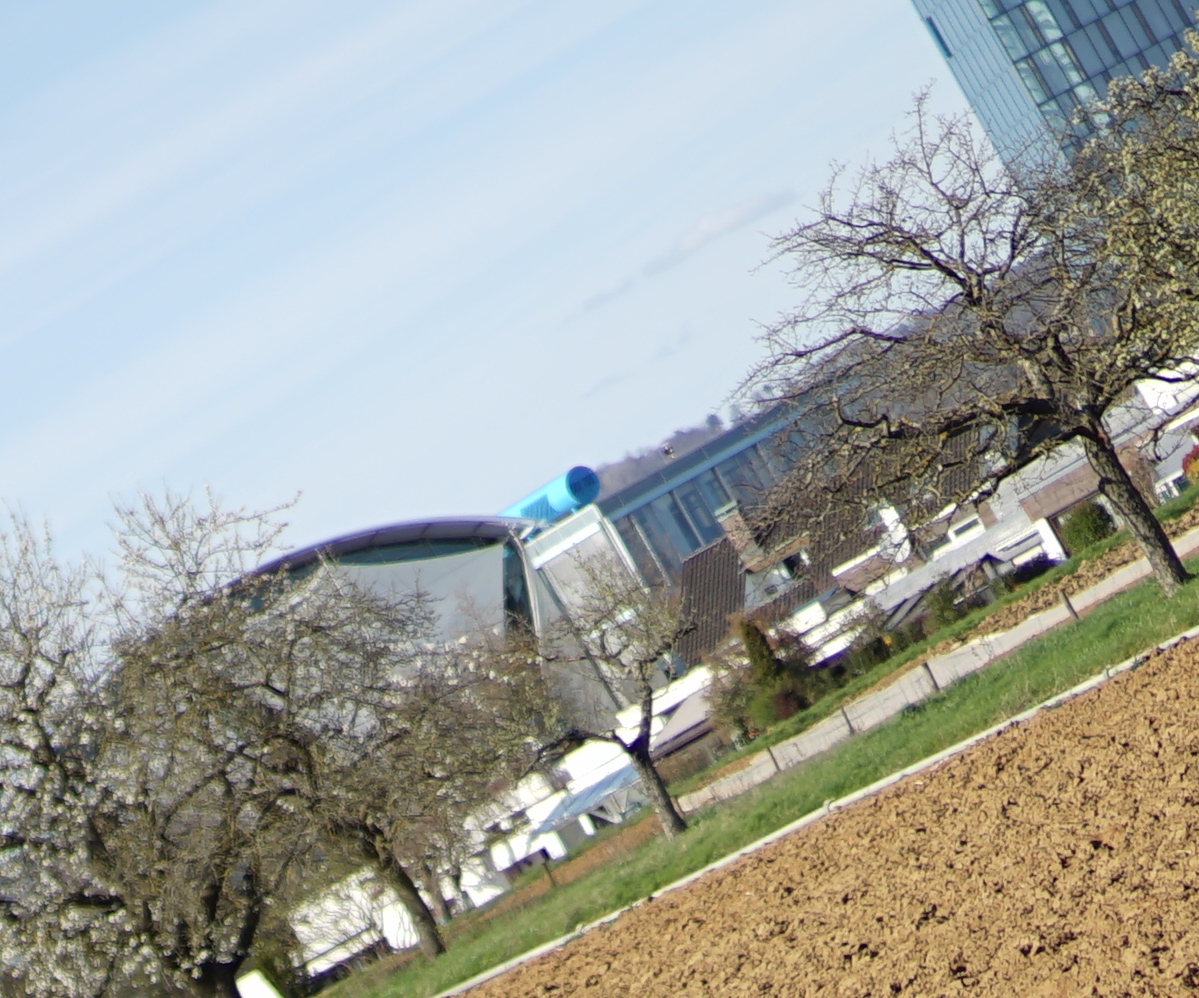 Zum MC Rokkor: obwohl die blaue Röhre beim MC Rokkor wegen der größeren Brennweite 58mm ganz am Rand ist, kommt die noch einigermaßen scharf. Auch der Schuppen hinter dem Zaun sieht noch ok aus. Der Oldie ist also bei Blende 8 auch am Rand noch brauchbar.