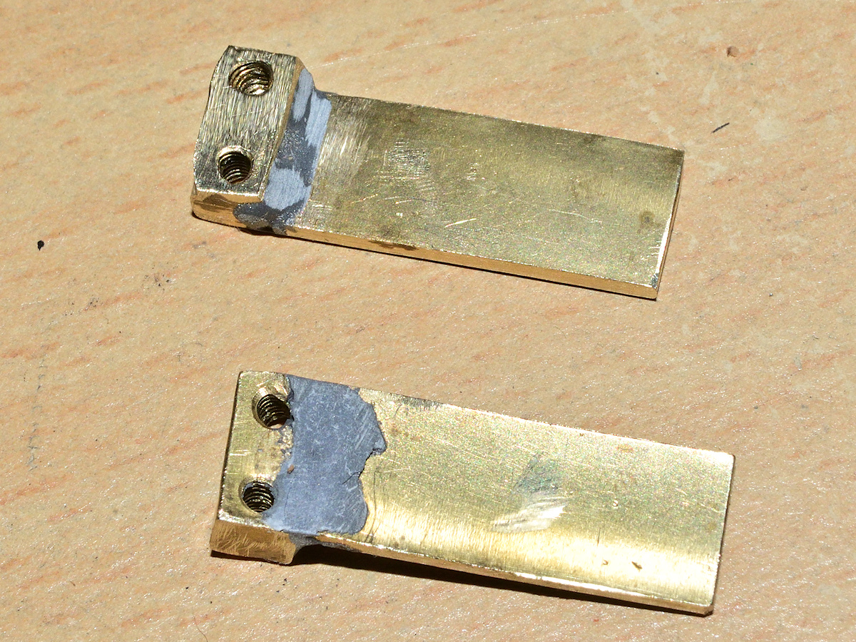 und deren Länge von 35 auf 24 mm gekürzt, dann mit Schlüsselfeile und 800er Schleifpapier passen gemmacht (links die nachgebauten, rechts die verbogenen und nicht mehr fest klebenden Originale)