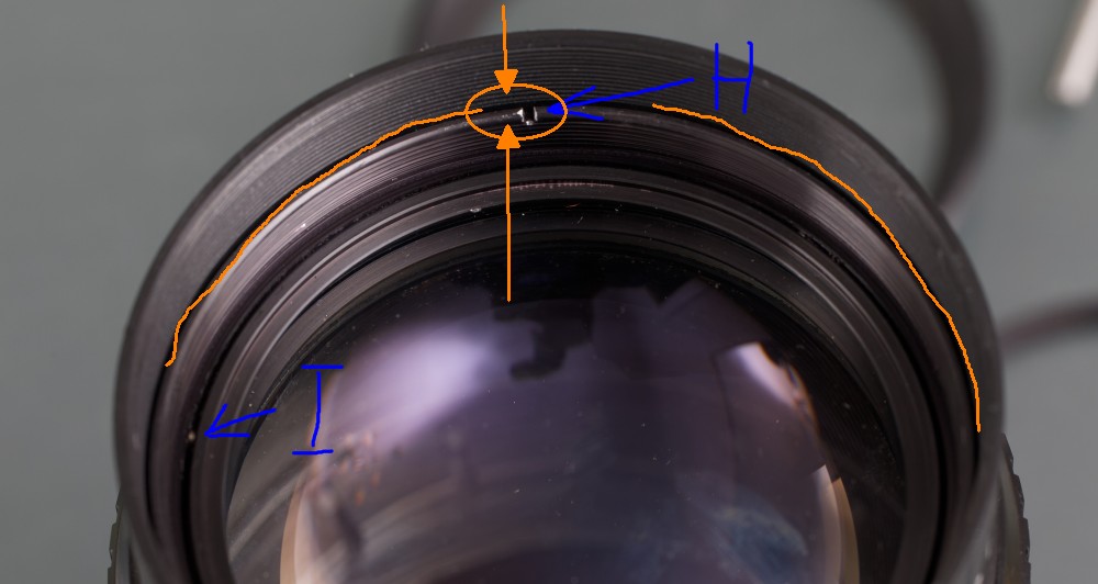 Bei I sind drei Schrauben, die offenbar die Frontlinse justieren. An diese Schrauben