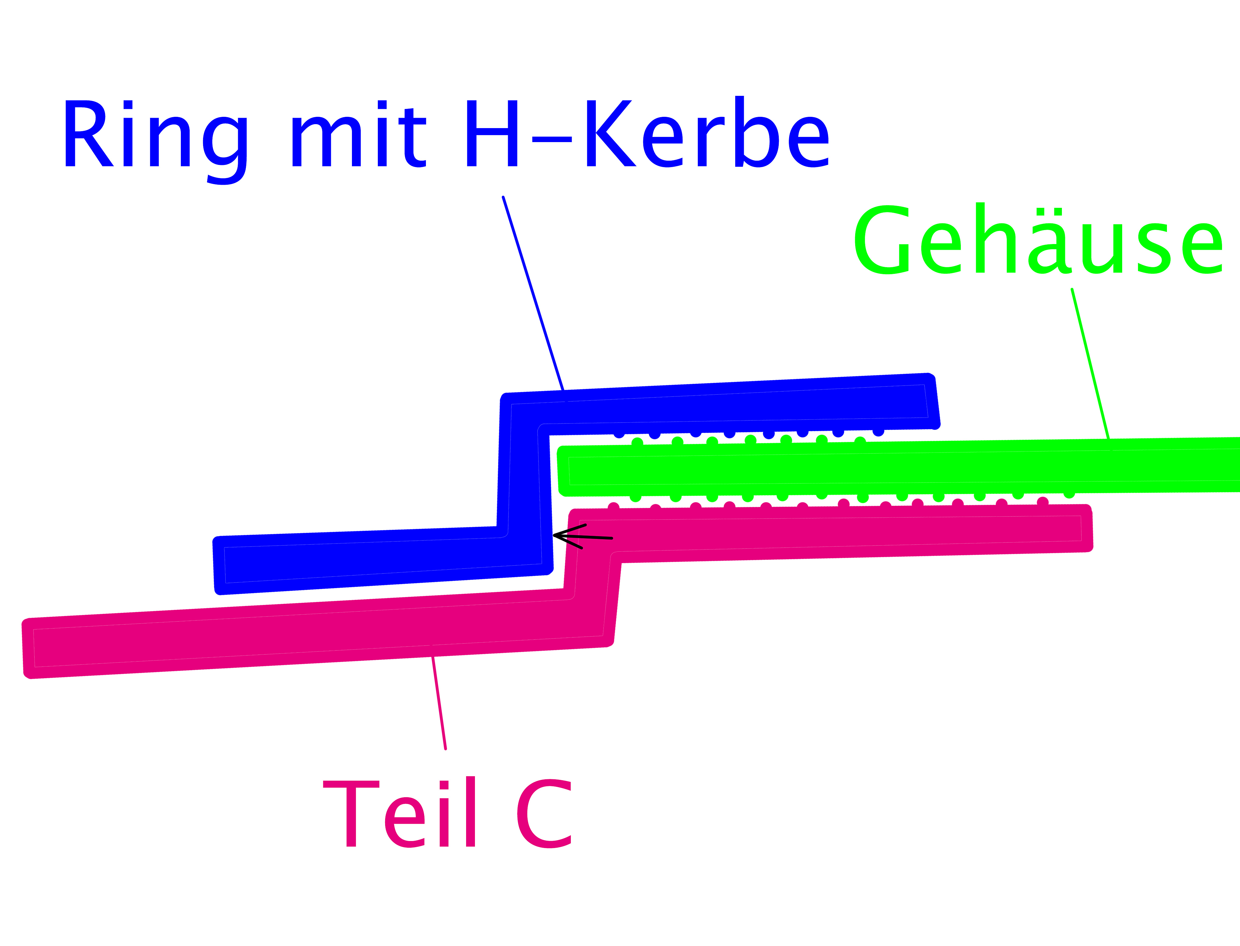 Bei dem Versuch, Teil C herauszuschrauben hat sich Teil C gegen den Ring mit der H-Kerbe gepresst (schwarzer Pfeil).