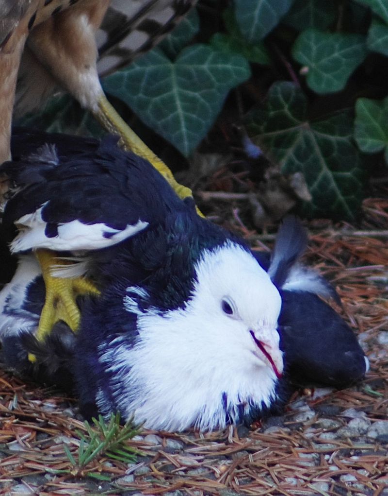 als sich im Hof vor dem Fenster ein Falke mit einer frisch geschlagenen Taube niederließ und diese umgehend verspeiste. Dieses Schlachtefest dauerte eine ganze Weile,