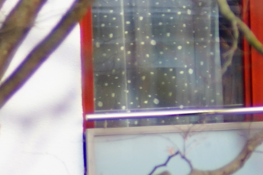 Zur Ehrenrettung des REVUENON 2.8/135 bezüglich Mittenschärfe muss ich nachstehende Bilder einstellen. Der Fokus liegt auf dem Fensterrahmen, beim Dachbild unterhalb des Schornsteins.