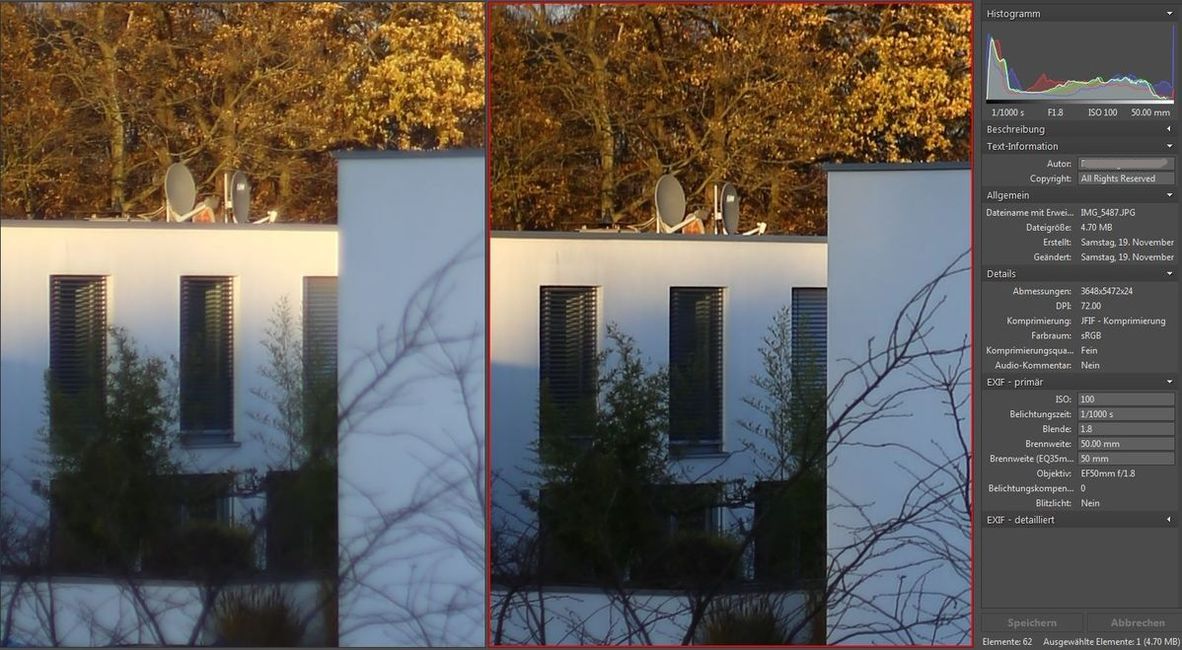 Also hier mal bei offener Blende F 1.7 bzw. 1.8 , links Zenitar, rechts Canon, Crop Mitte Links , alle Fotos mit Canon 6D, also KB.