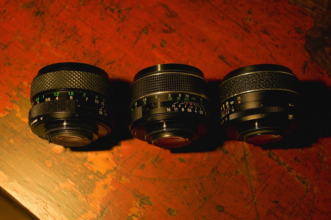 Von links nach rechts: Cosina (1977, Kit zur compact reflex SP, hab auch das passende 1,7/50 MC, das mit der weniger tief versenkten Frontlinse), Cosina (1975, Kit zur C-TL super, wie meins), das rechte sollte eher einen Chinon-Gegenpart haben. Die verschiedenen Hersteller in der Gegend waren aber damals anscheinend eh ziemlich stark verbandelt, auch über Teilezulieferer, und ein identischer Linsensatz liegt nahe. Sehr ähnlich zum Cosinon (in der einfachvergüteten Variante) auch dieses Auto Rikenon - ich vermute ja schwer, daß Cosina die damals für Ricoh hergestellt hat.